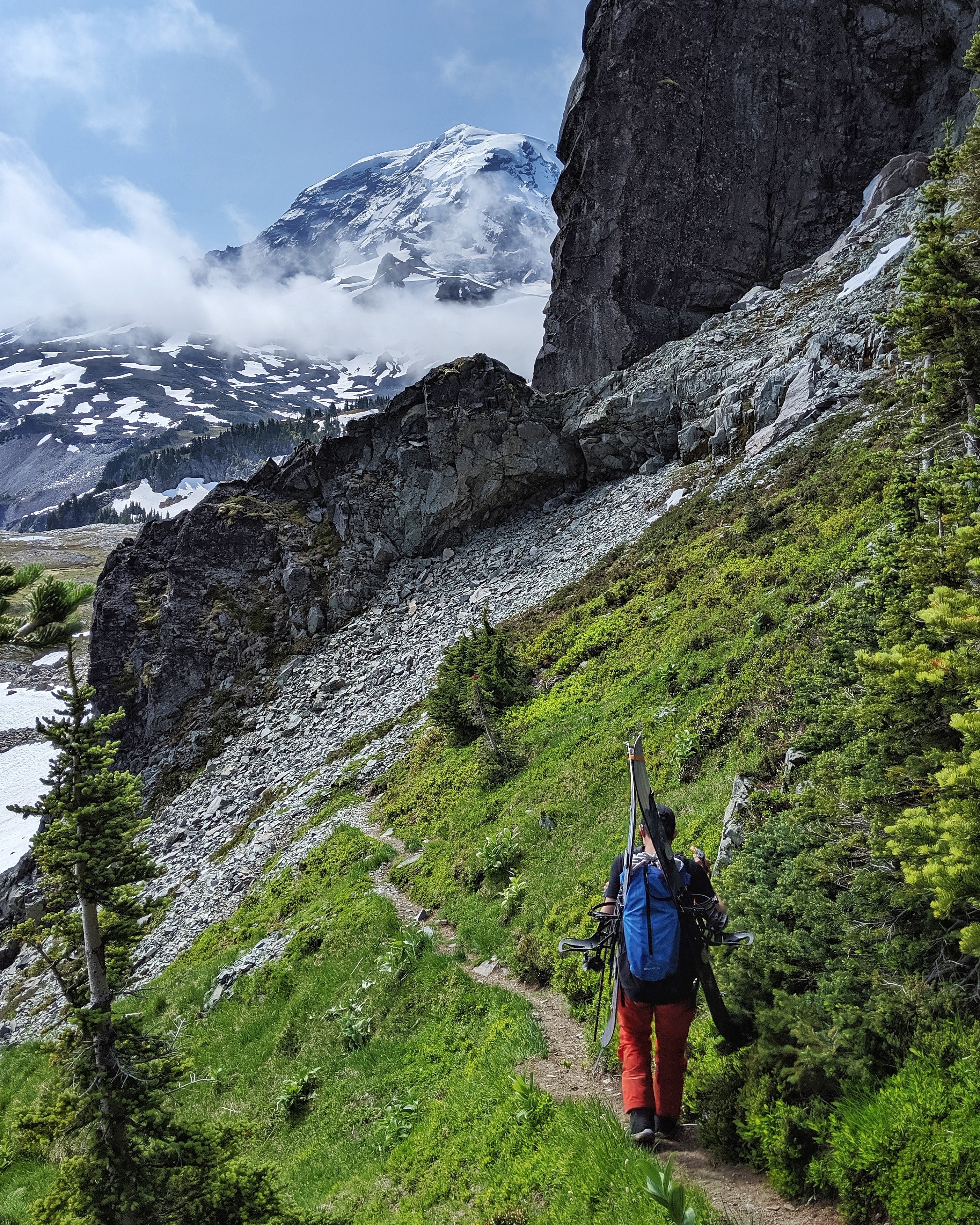 昨天已经是七月中旬——七月十四日,竟然还能背上板去滑雪。这次从Mowich Lake Campground出发来到Observation Rock。于是Mount Rainier的三面approach都已造访过了。虽然此行的approach很长,drop的距离也很短,但是雪况意想不到的不错,沿途的风景也值得留恋。学习认识了Avalanche Lily——Erythronium montanum,和Glacier Lily——Erythronium grandiflorum。