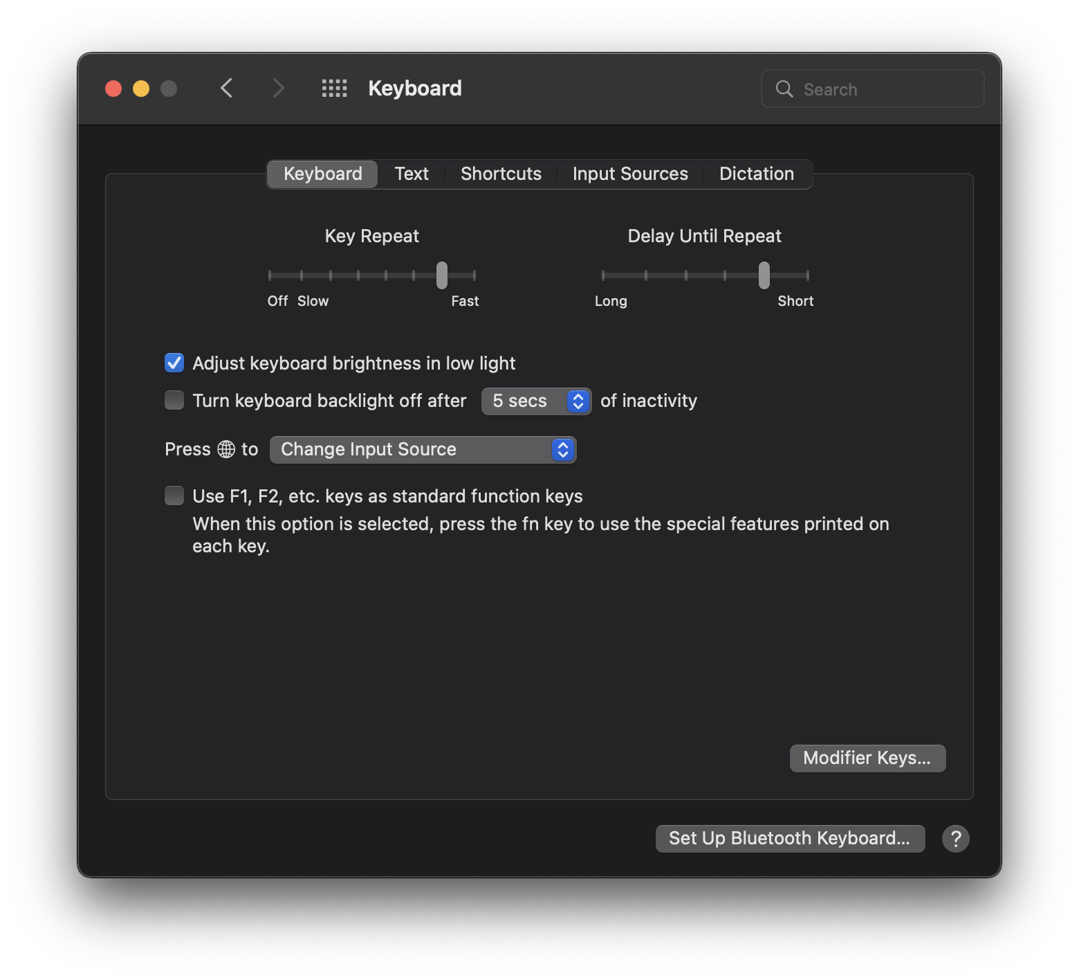 Keyboard Key Repeat: Fast Delay Until Repeat: Short