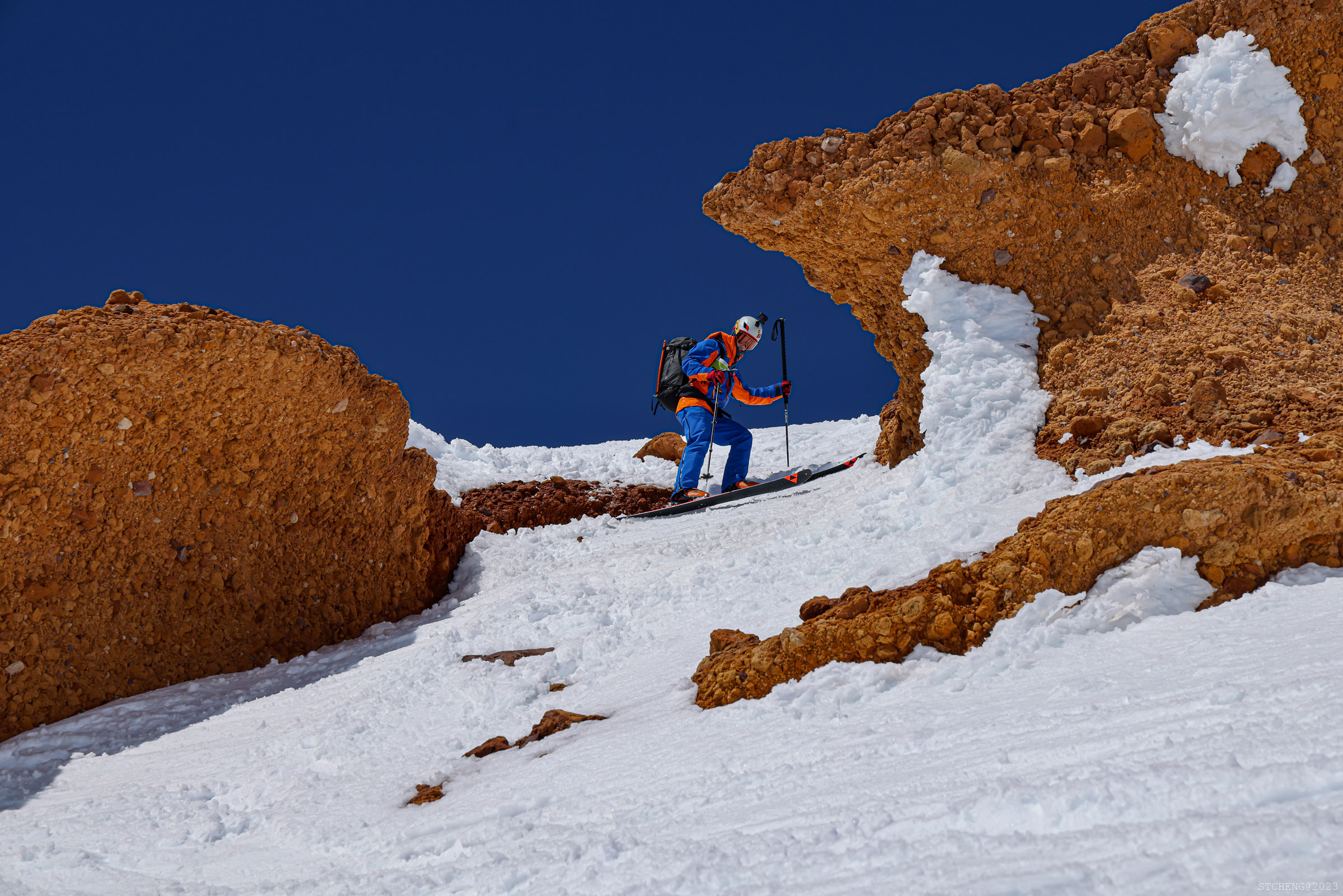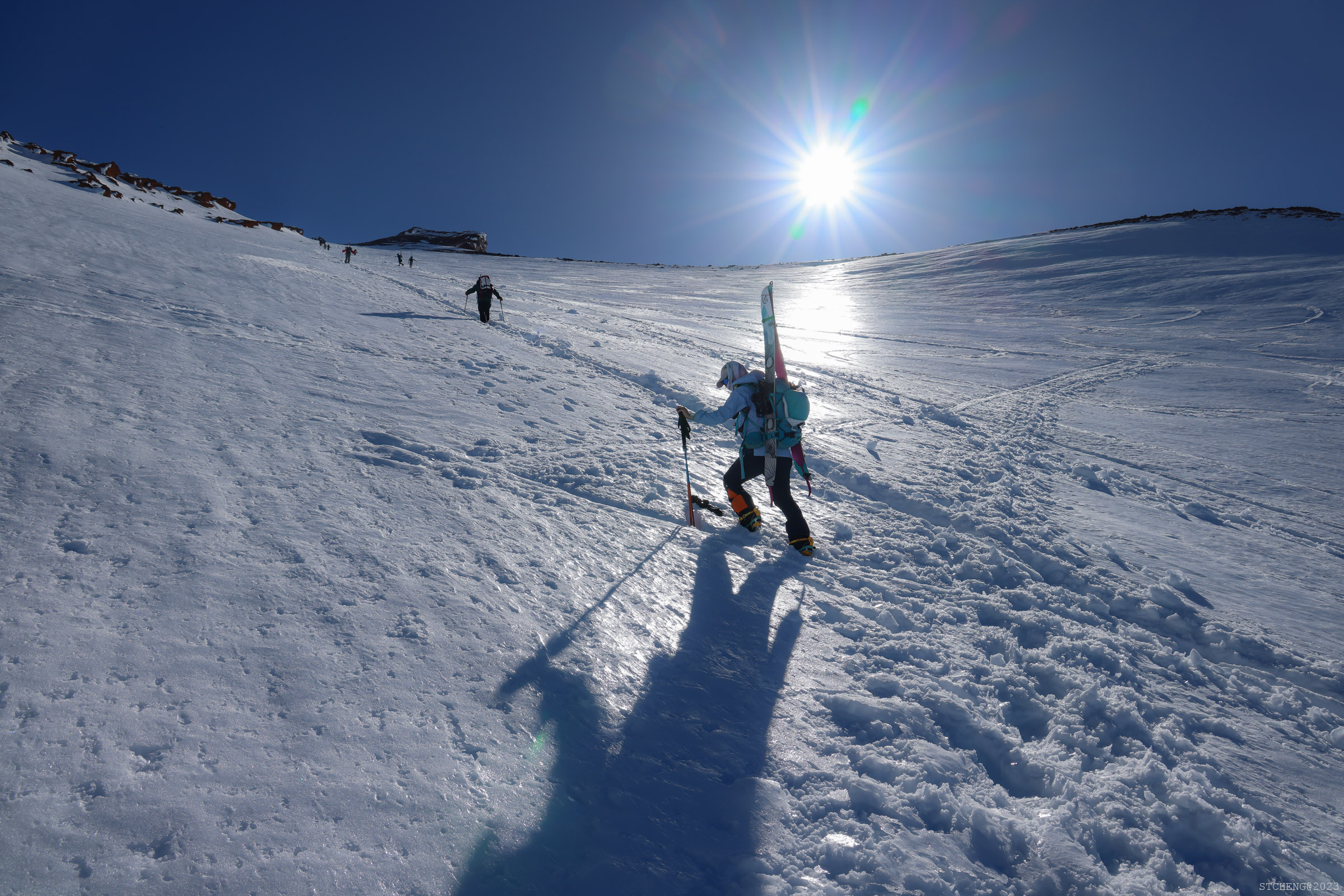 As we pressed on, we could feel the once-melted snow had refrozen beneath our feet, creating a layer of ice that made the ascent challenging without crampons. At around 4 AM, the moon finally emerged, swiftly illuminating our surroundings. With two more hours of steadfast effort, the sun eventually crept over the cliffs. The powerful solar radiation rapidly melted the frozen world around us, transforming our surroundings into a glistening wonderland.