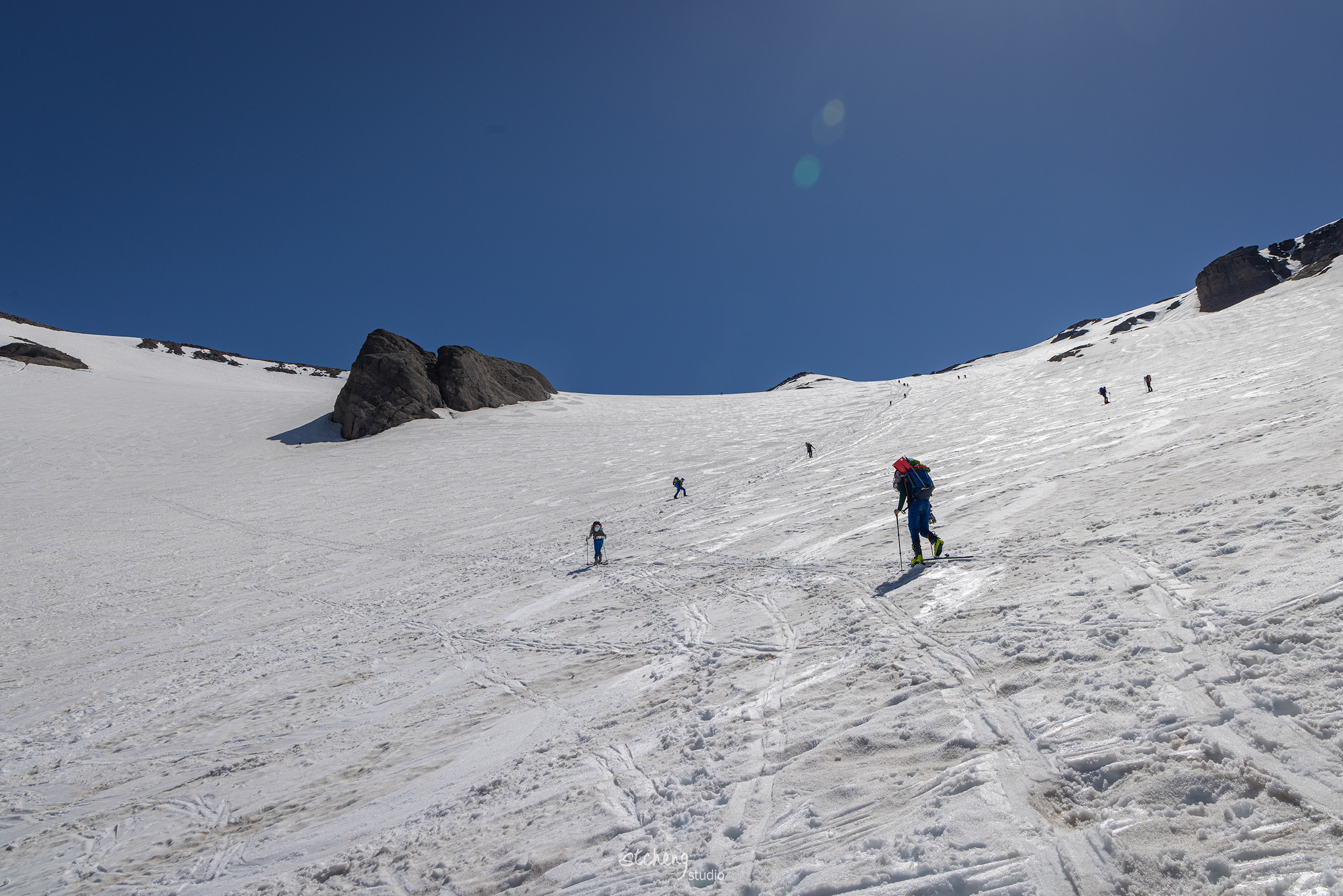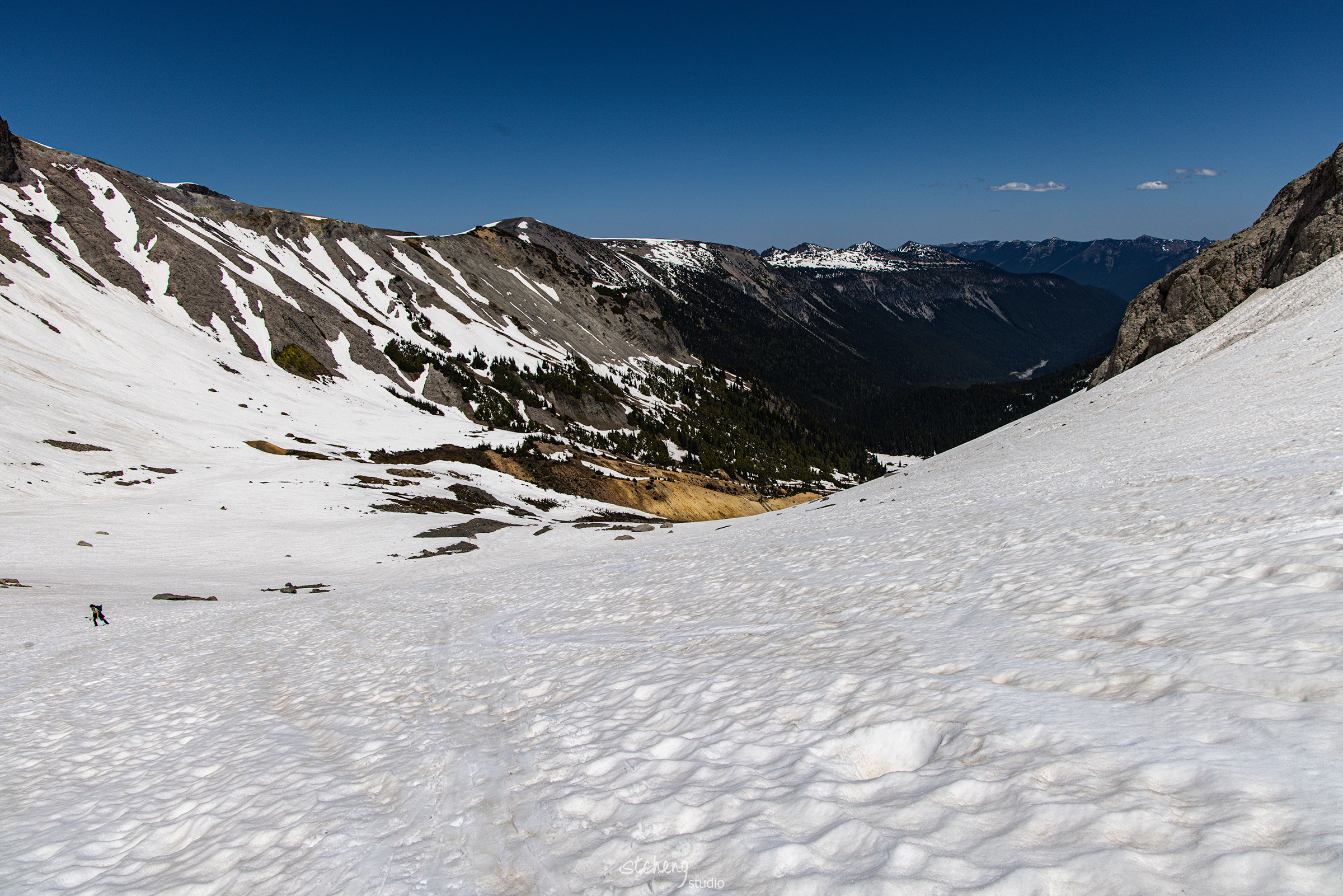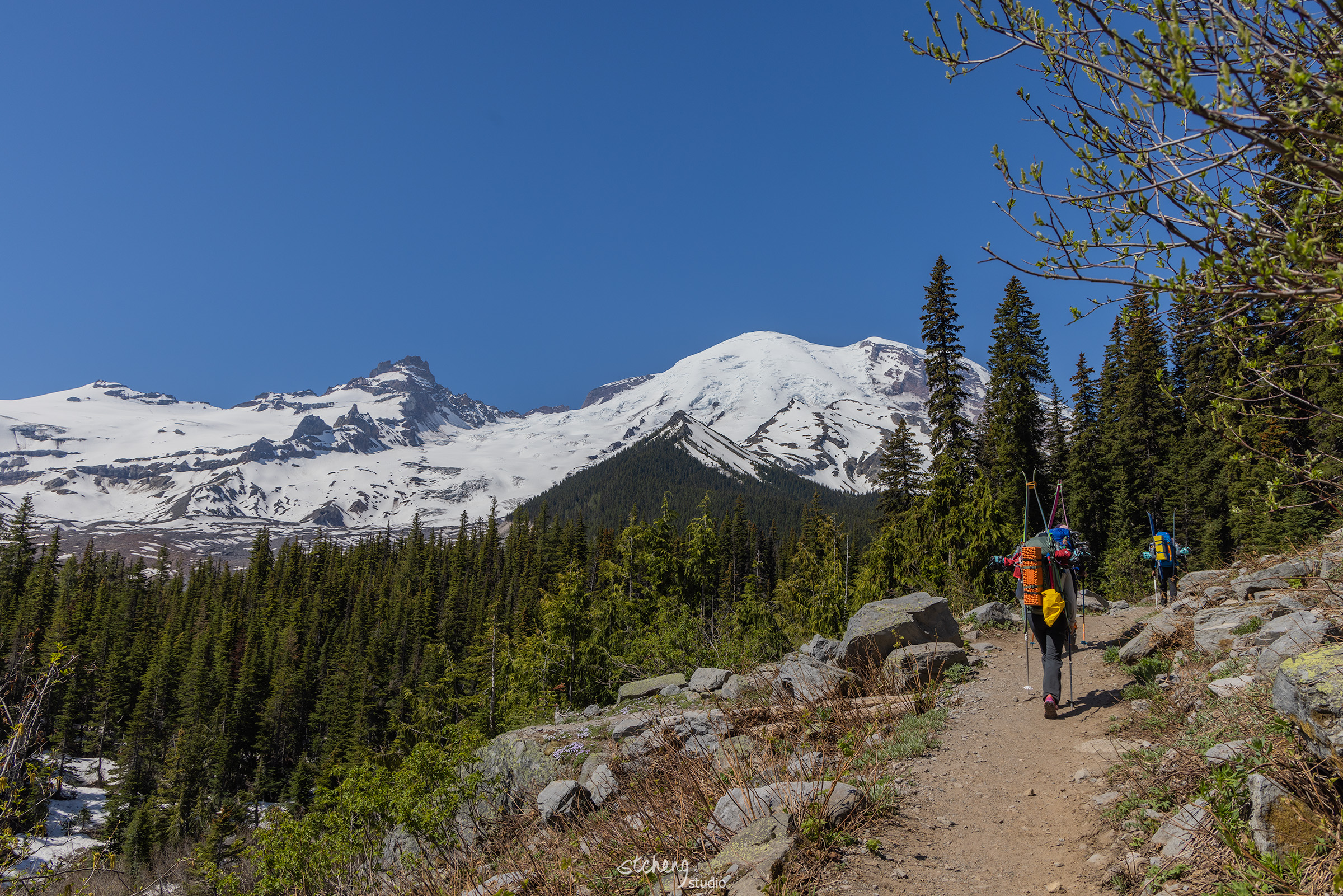 We set off at around 10AM. The trek was laborious, requiring us to bear the weight of all our equipment and camping gear on our backs until we finally reached the Glacier Basin and the adjacent river bank. Ascending under the relentless sun was no small feat; it was a taxing endeavor. Engulfed by this challenge, my friends and I kept our eyes on the trail, barely noticing the surrounding vistas, pushing ever upward. The melting snow underfoot added a slippery element to our climb, particularly challenging for us snowboarders.