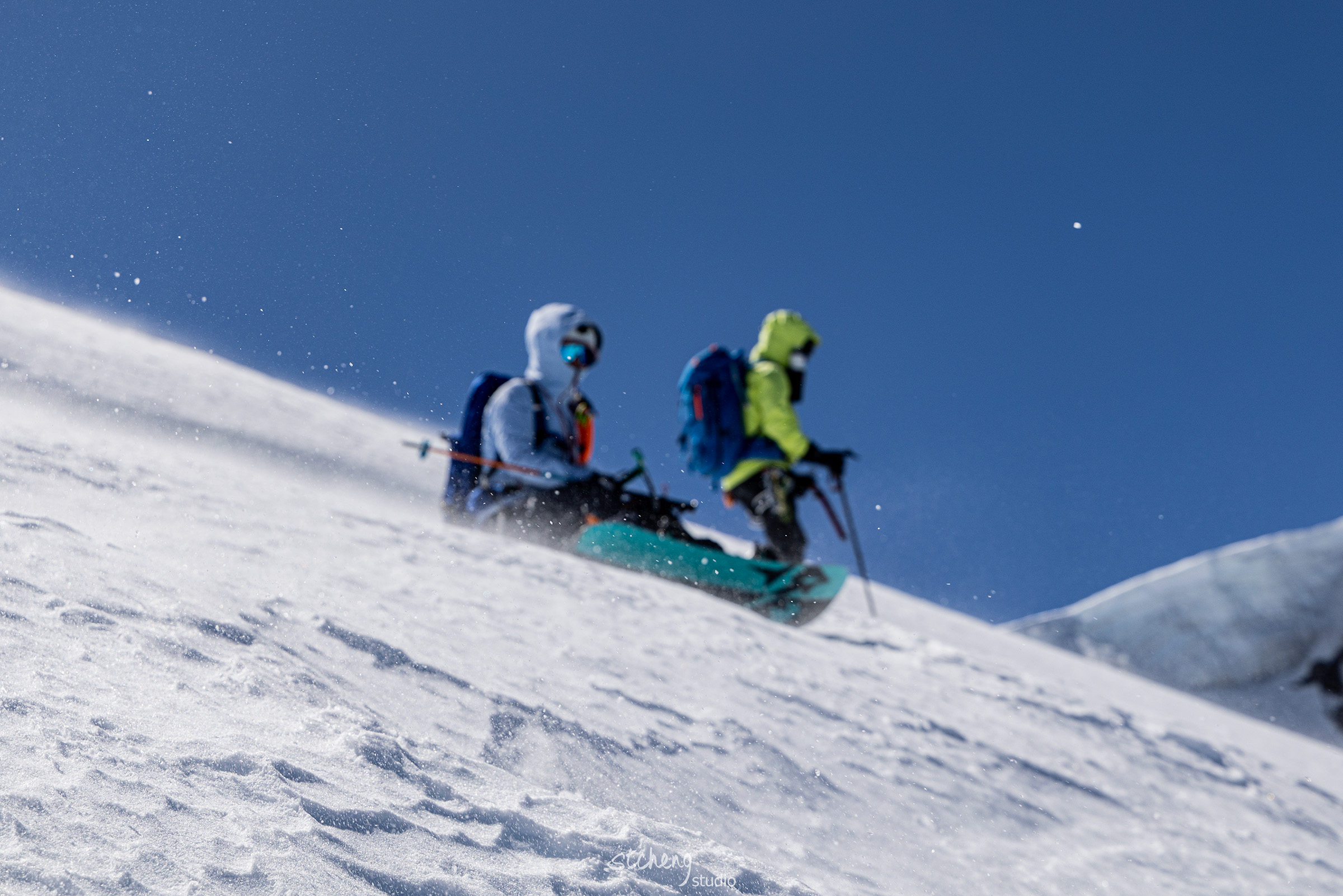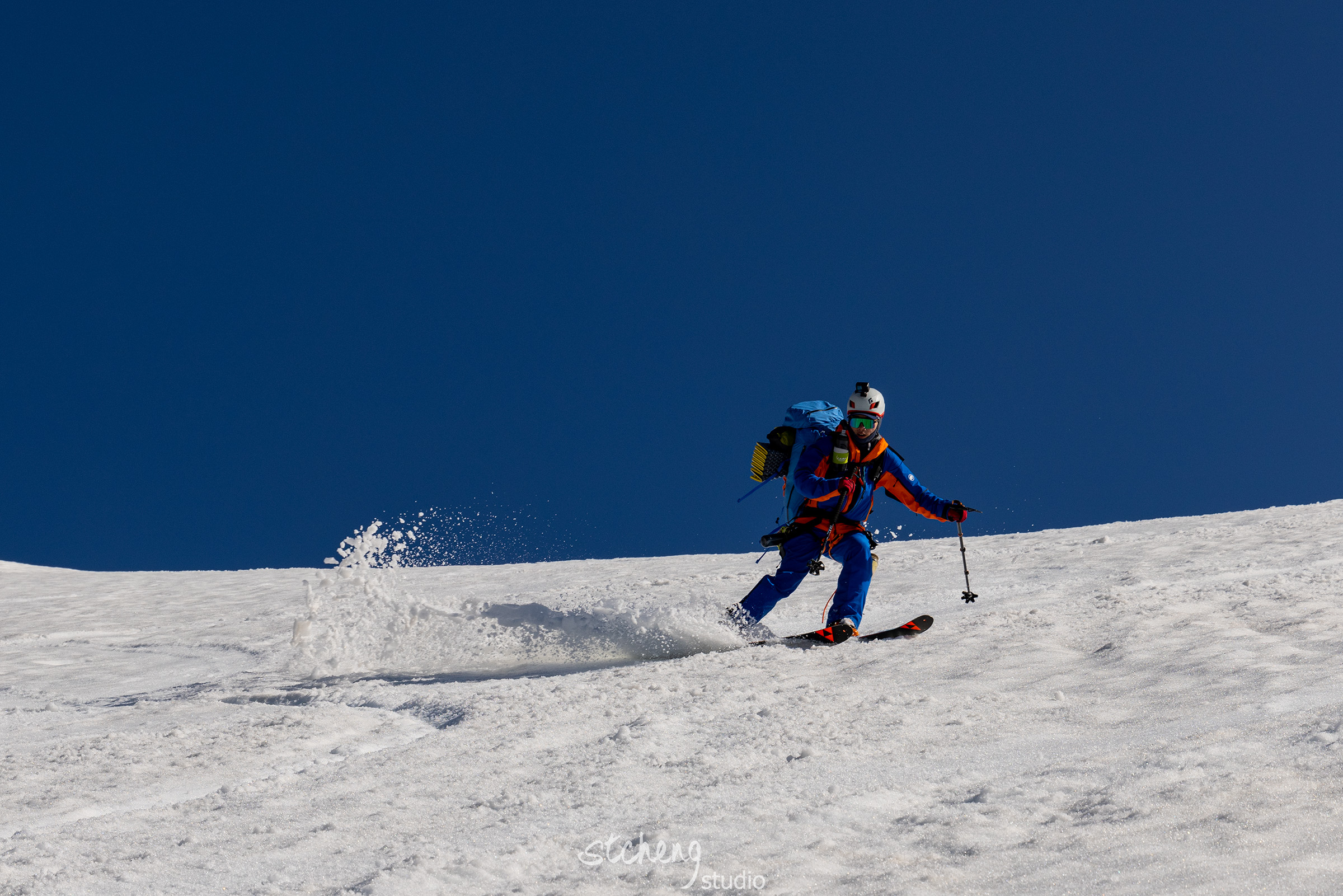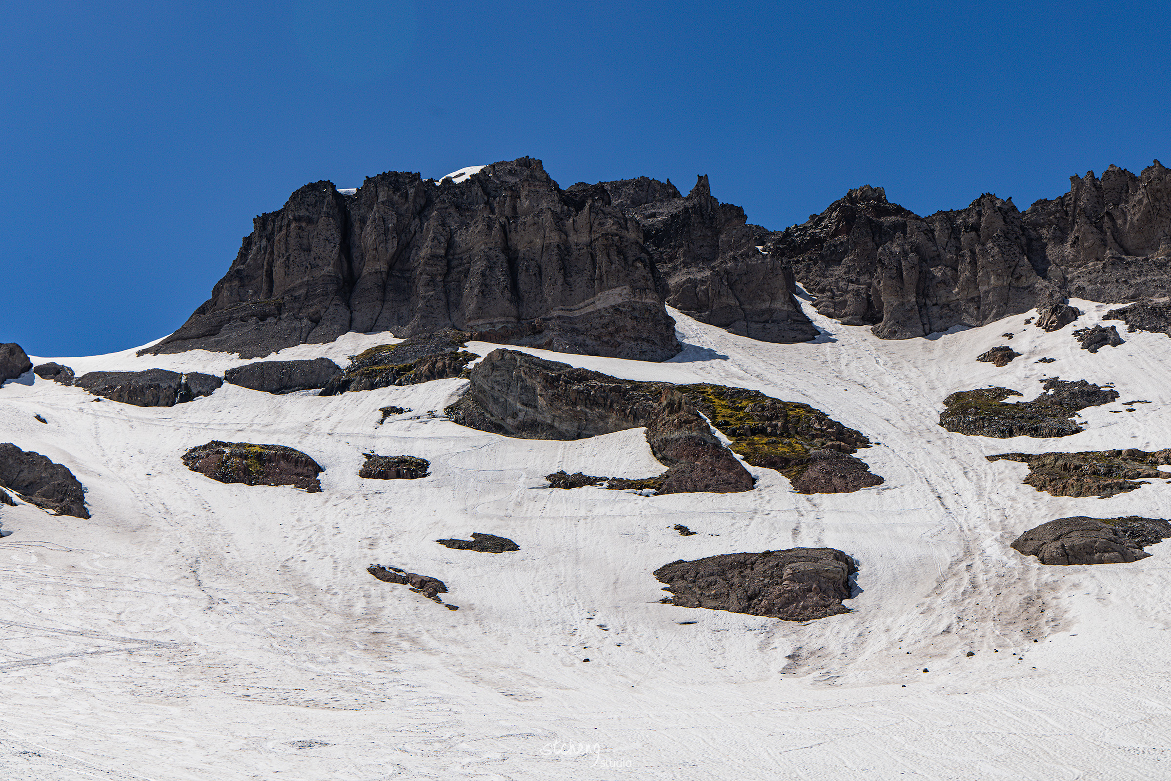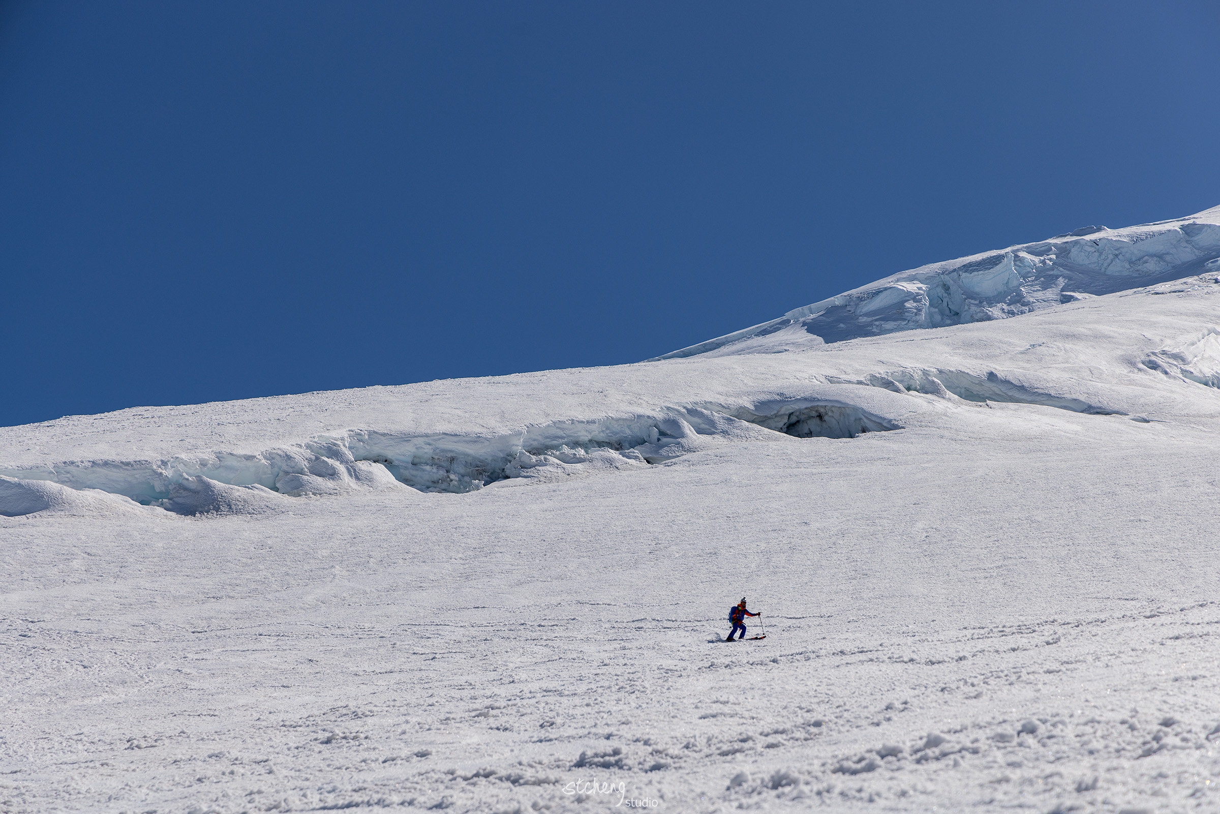 The descent, I would say, was quite an ordeal; one where we found ourselves sliding on the surface of a freezing glacier littered with irregularly shaped ice chunks. For the sake of safety, we had to dismount our snowboards and navigate on foot across the traverse route, keenly aware of the crevasse lurking beneath. Upon returning to the Emmons Glacier, we retraced our morning tracks to ride downhill. Despite basking under the sun for almost an entire day, the glacier remained as icy as stone. A fragile layer of ice crystals lightly coated the surface, undulating like sand waves when wind stirred them. Alarmingly, the crevasses we had crossed earlier in the morning were noticeably widening.