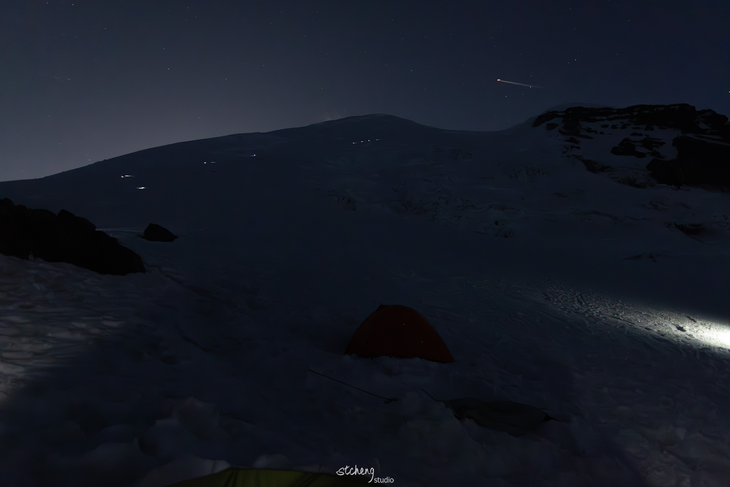 By the time we transitioned from the Inter Glacier to the Emmons Glacier, it was nearly 4PM. Upon arrival at our Camp Schurman campsite, we were relieved to find the wind mild. While the occasional gust did catch us off guard, it was, for the most part, bearable.