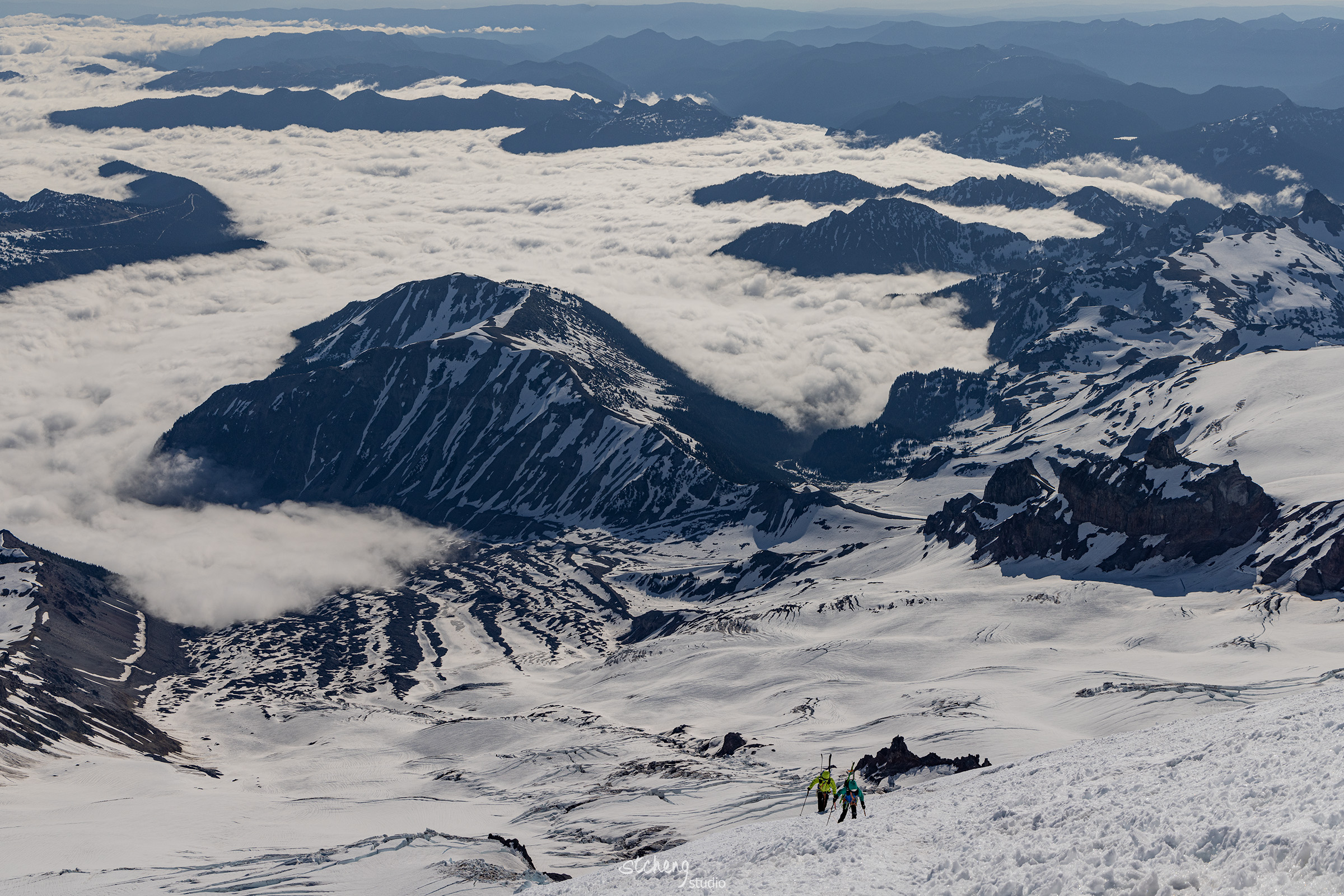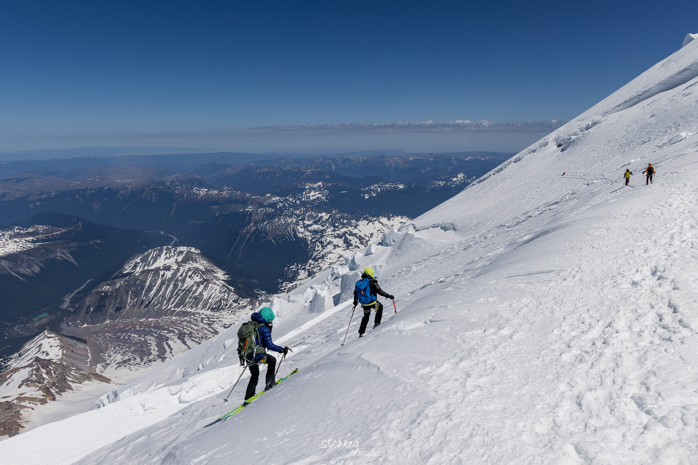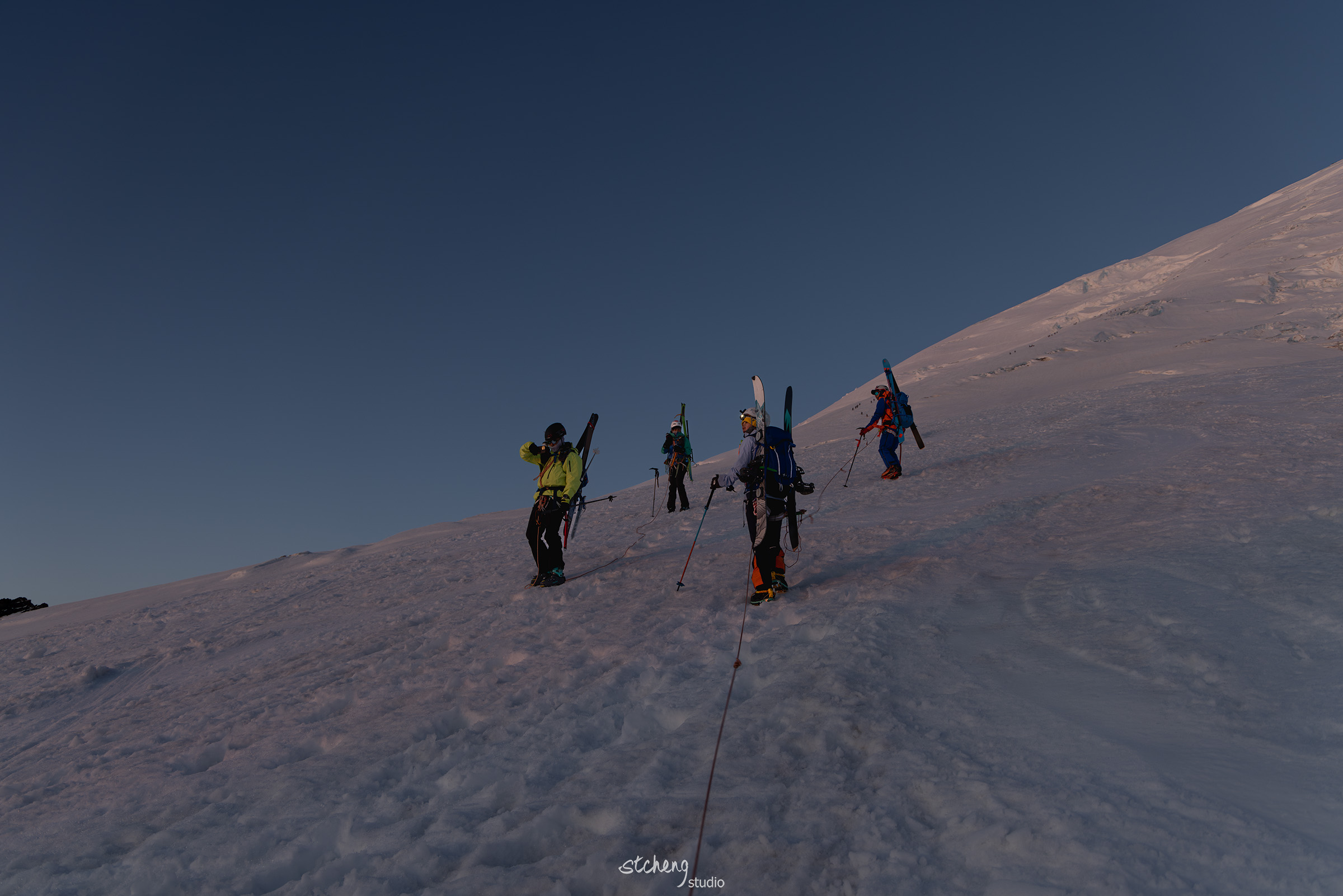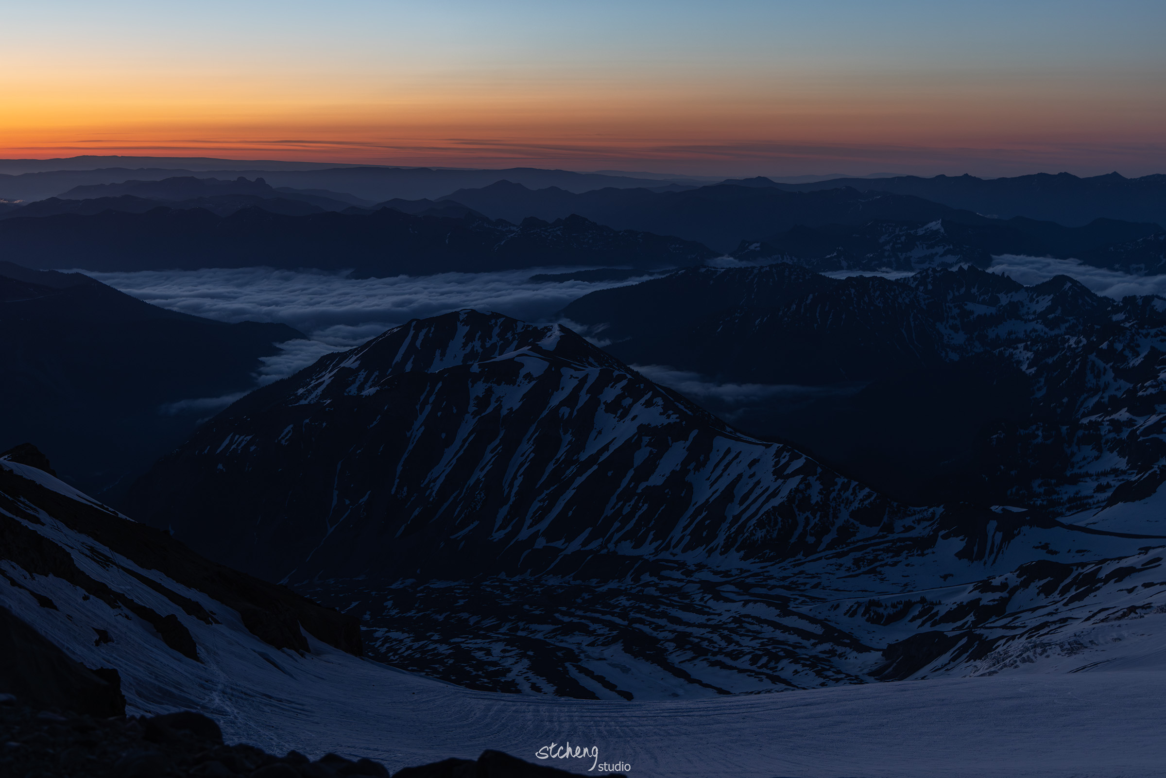 Although we set our alarms for 3AM, it wasn’t until 5AM that we were fully prepped and ready to begin our ascent. After less than thirty minutes, we found ourselves standing on the slope, basking in the dawn sunlight filtering in from the distant Cascade Range. A sea of clouds gradually gathered, swallowing the lower forests and leaving only the peaks of the Cascade Range visible, akin to islands emerging from an ethereal ocean. The sky transitioned from a dark blue to a brilliant orange before settling into a clear azure. We divided ourselves into two teams, tethering each member with ropes, and steadily continued our upward journey.