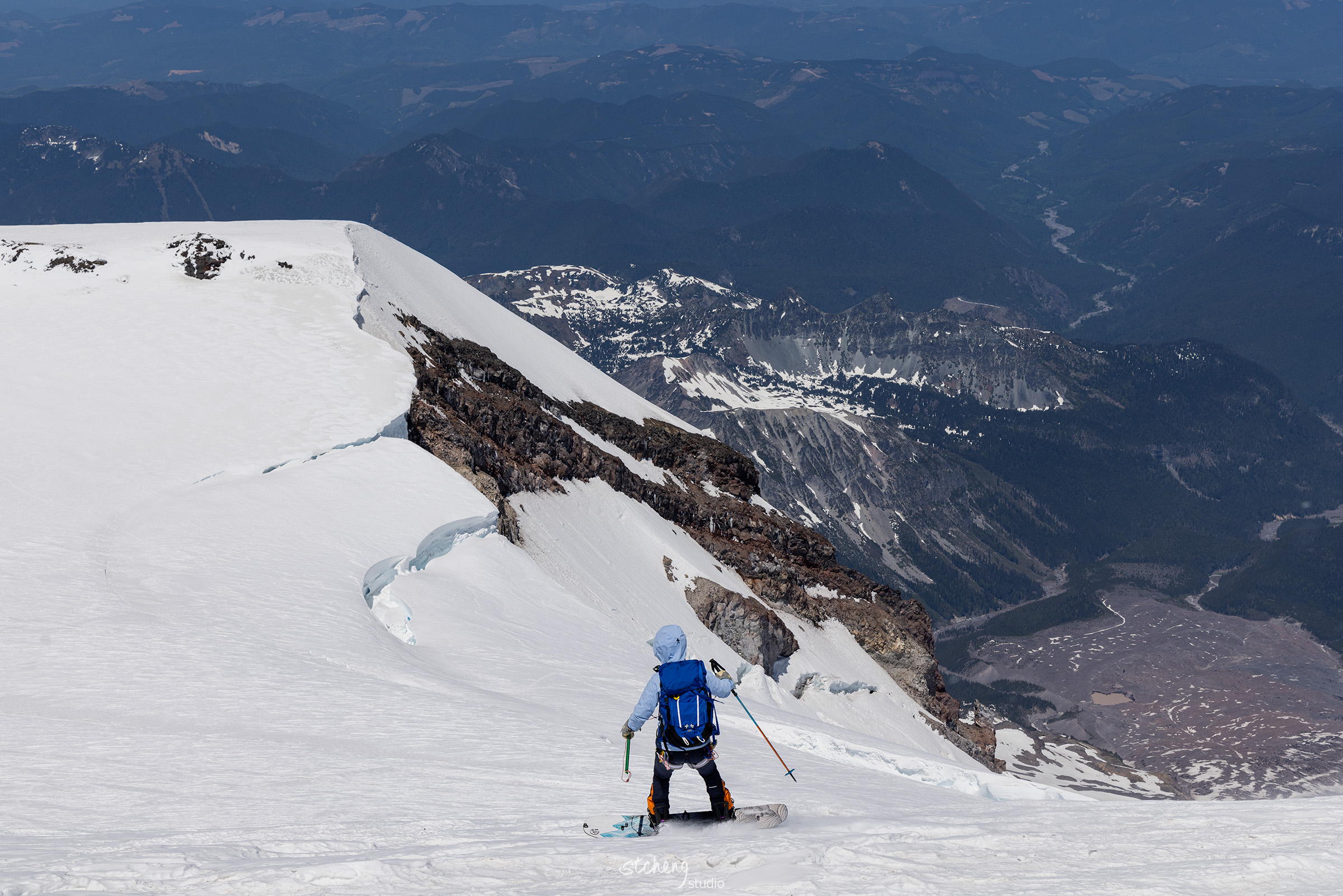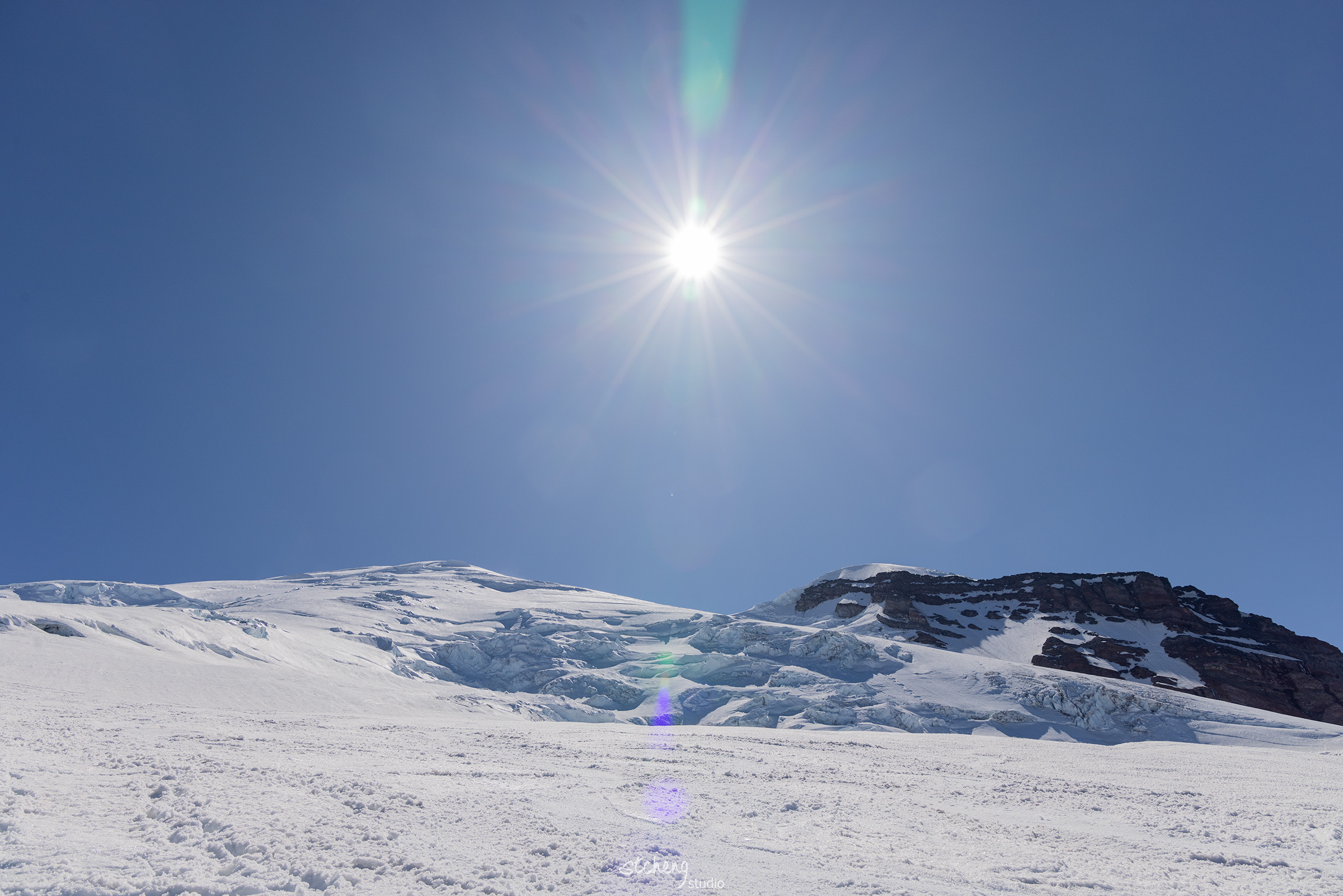 This marked my third departure from the White River campsite and subsequent arrival at Camp Schurman. My first venture here was to snowboard down the Inter Glacier from the apex of a wedge aptly named the Steamboat Prow. Standing on the precipice of the prow, facing the imposing mountain, one finds oneself at a loss for words to capture its awe-inspiring grandeur.