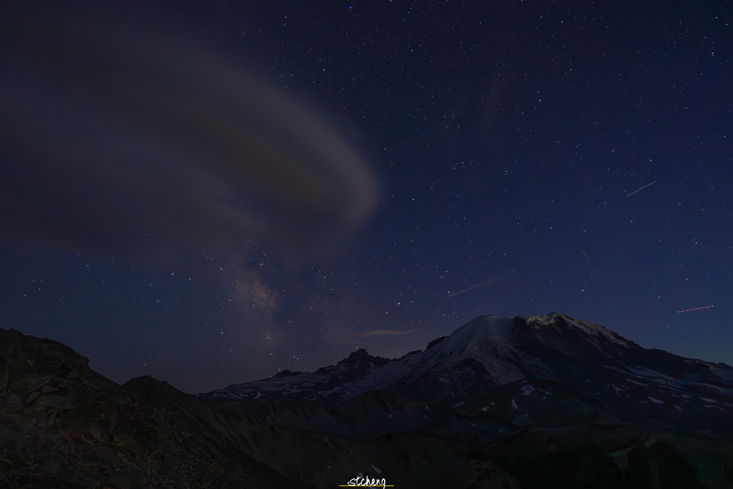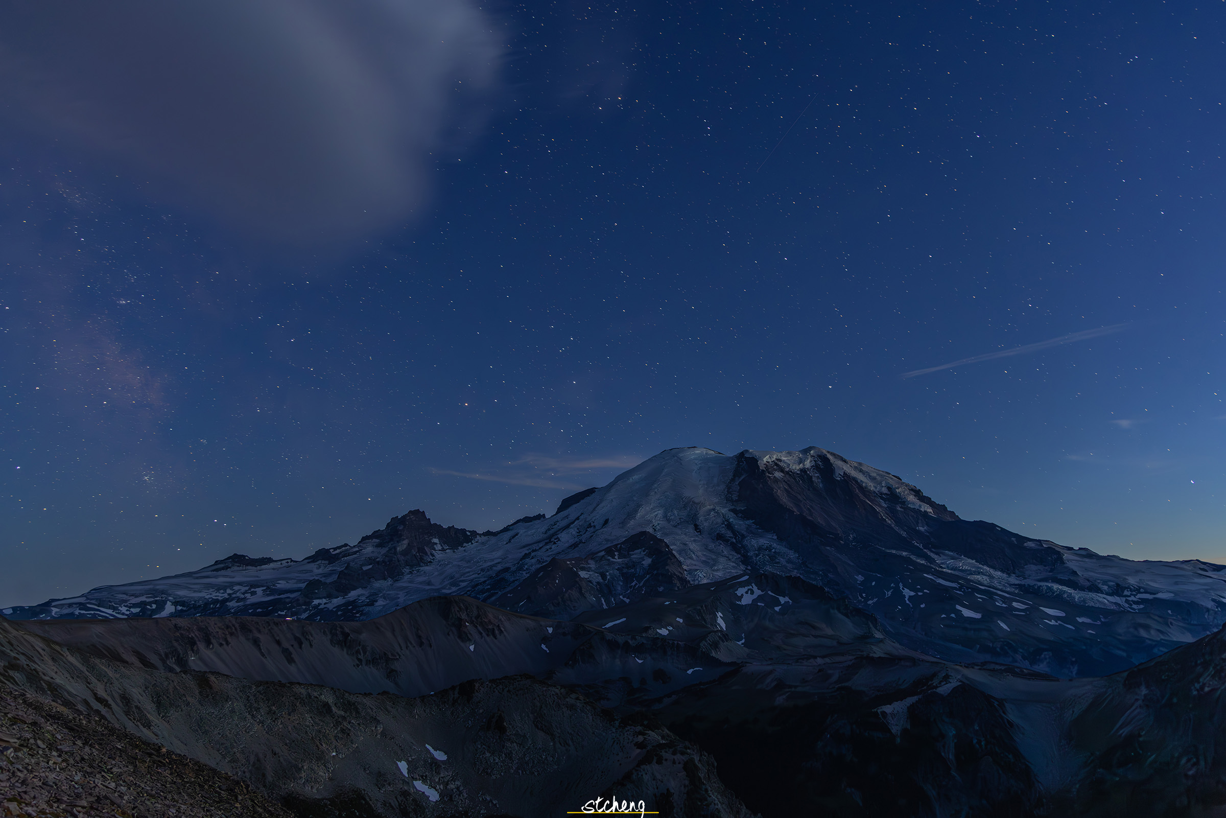 Here are photos captured en route to Mt Fremont Fire Lookout on August 11th, undoubtedly a perfect vantage point to enjoy Mount Rainier against the backdrop of the Milky Way. The one-hour casual hike began just before sunset, following the path of the Sourdough Ridge Trail towards the Frozen Lake, and then transitioning to the Mt Fremont Trail leading us to the fire lookout. There, we spent an hour or two before returning under the midnight sky.