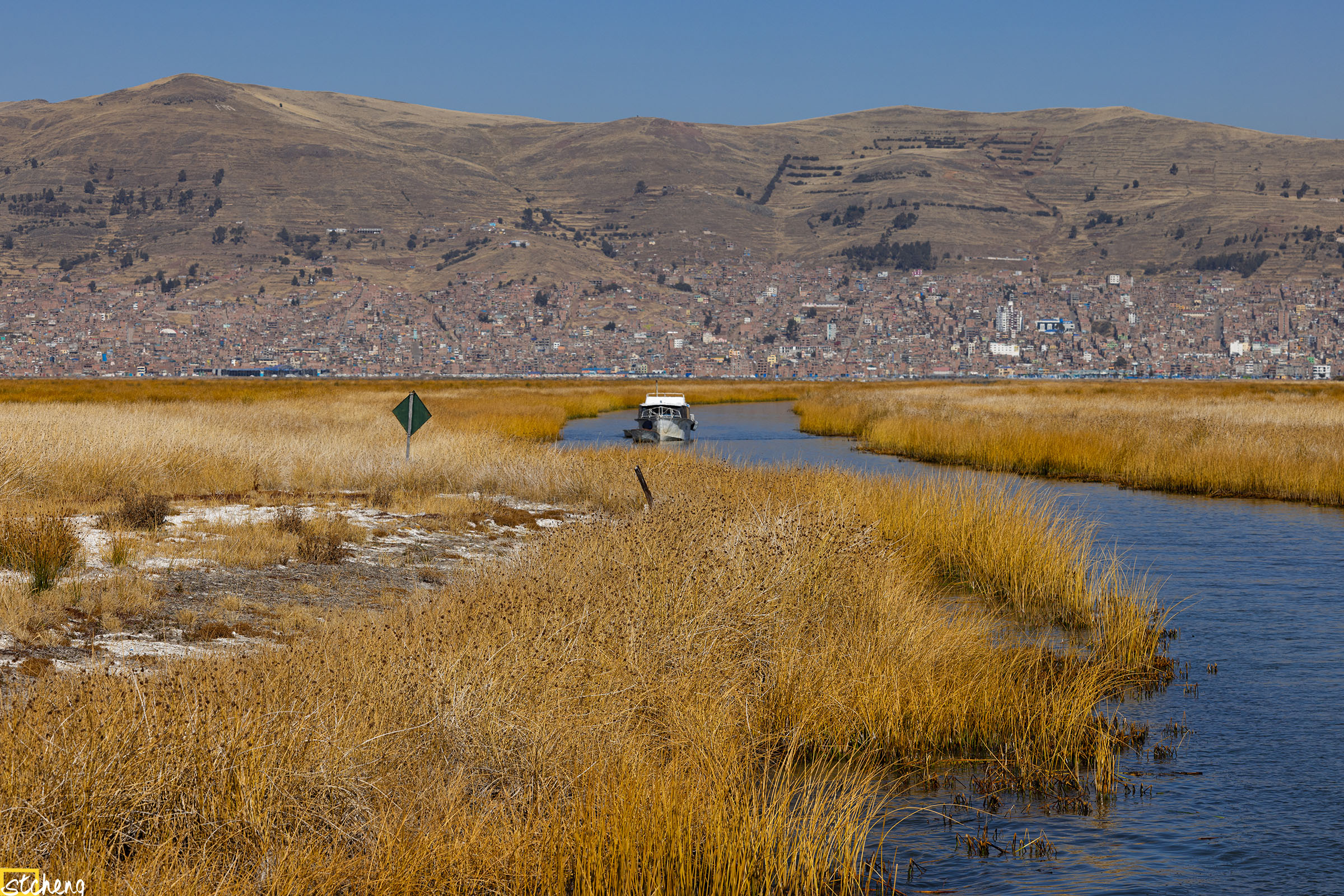 不愧是上过正大综艺节目的目的地,提提卡卡湖(Lake Titicaca)的确与众不同。湖坐落于海拔四千米之上,周围皆是黄土丘陵,独普诺(Puno)一面密集的都是房子,裸露的砖的红色,或者粉刷成黄色或者白色,在经年累月的沙尘的冲刷下也都褪去了饱和度,和背景的山融为一体,从湖边一直延伸至半山腰。