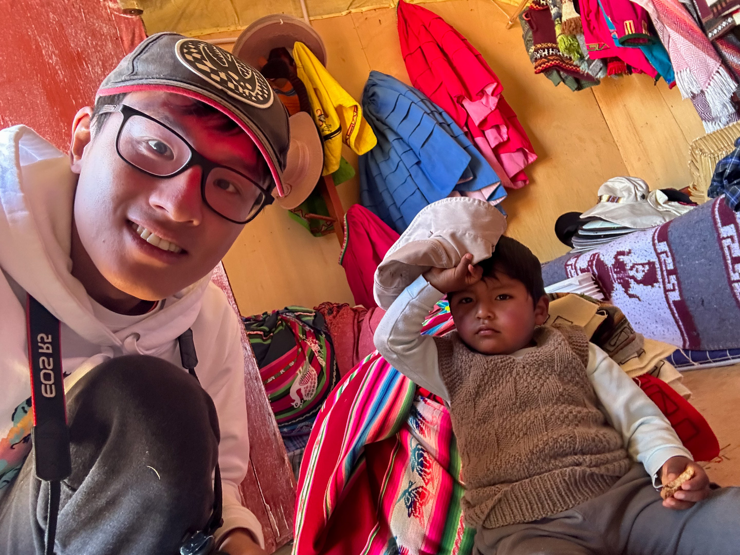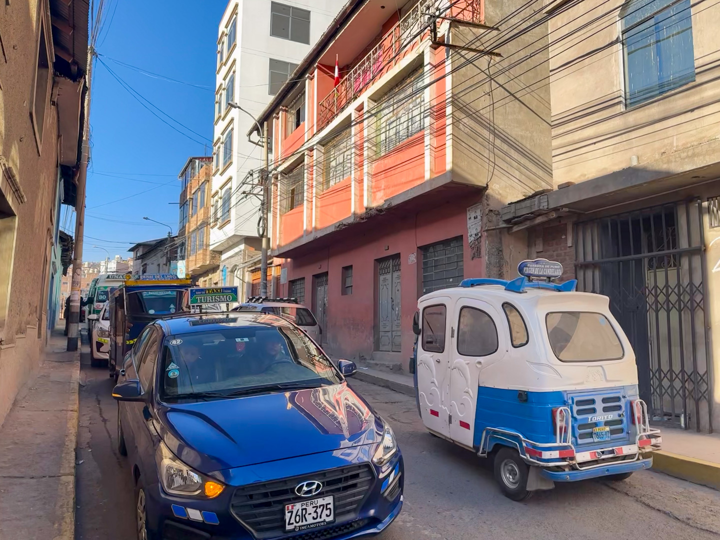 小镇说小很小,一个教堂坐落的中心广场,从广场发散出去两三条还算热闹的步行街,临街的店铺也基本是小卖铺,办理电话卡,杂牌衣裤运动鞋之类的小本生意。看得出来,即使作为提提卡卡湖的门户“城市”,这个八线或十八线的小地方也吸引不了多少游客的长时驻足,顶多就和我一样,歇个脚,第二天就启程。说是歇脚,歇息的也只能说是差强人意。毕竟前一晚才刚从五星级酒店雪白柔软的床褥上醒来,今天就要住在一个招待所。没有稳定的热水,碰一下就掉落的灯罩,第二天早上“简练”的早餐。不过那时候的我们还没想到,没有最差只有更差。当然这是后话。