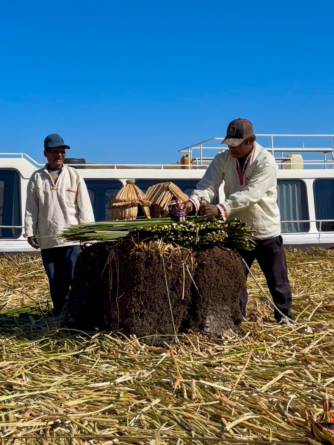 我们从船上下船蹦上芦苇岛,那一刻感觉到了整座岛的柔软。脚踩在厚厚的芦苇上就如同踩在厚厚的草垛上,可以很明显的感受到那份弹性。地面也并不潮湿,或许也是因为太阳正当头。几个当地人给我们做了一番介绍以后,给大家都各递过来了一根新鲜的芦苇,说外面的皮剥去了就可以直接吃,我尝了一口,果然充满水分,但是毫无味道,既没有泥土的腥味,也没有植物的鲜甜,只是水被松散的锁在了海绵和纤维组成的结构中。