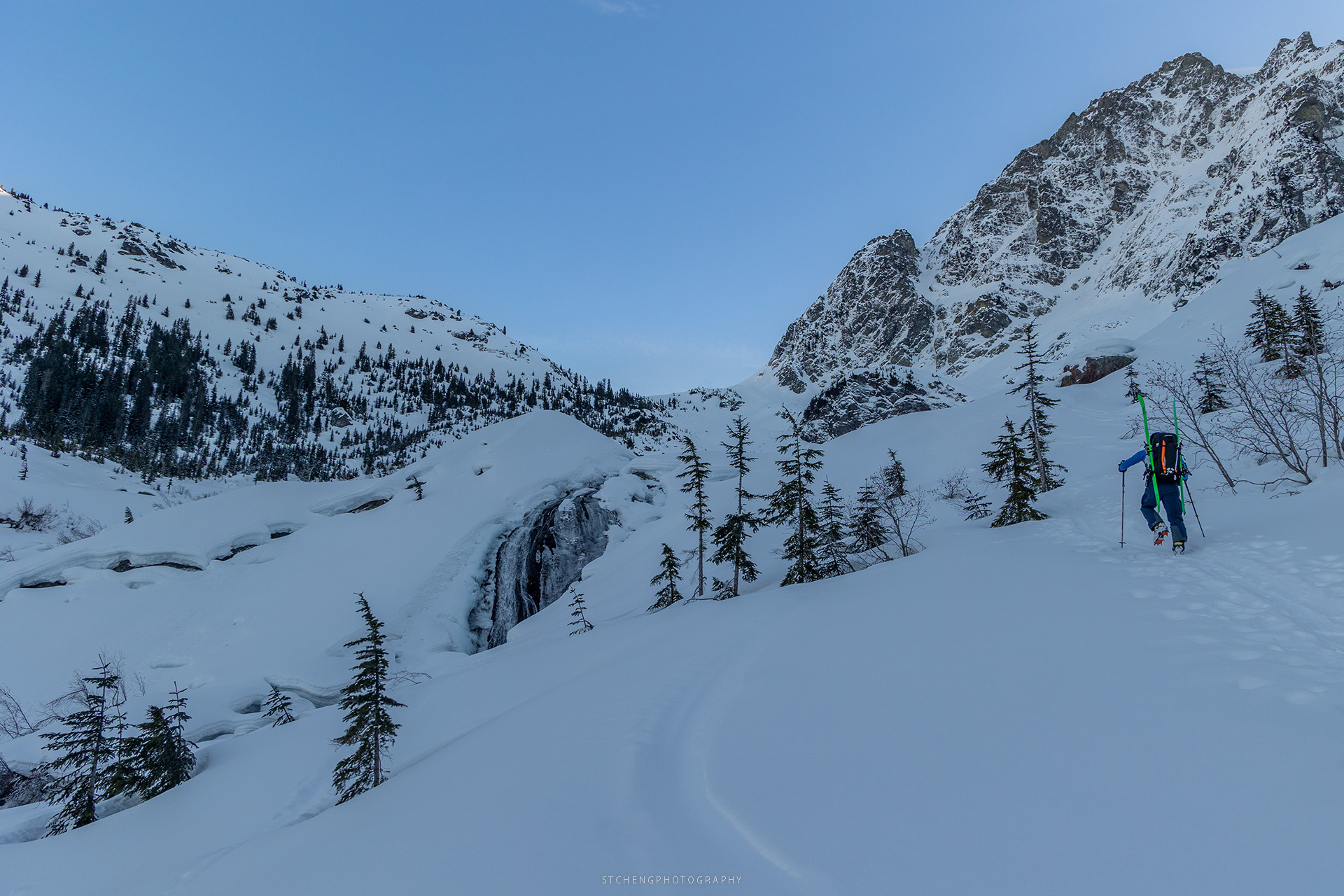 When we arrived at the parking lot, the local staff of Mt. Baker Ski Area had just started to arrive. Then the morning golden hour began. It was the alpineglow. It was probably one of the most pinkish and orange skies I had ever seen. Sadly, at that time, we were touring on routes surrounded by trees. By the time we entered an open area, the sky was already too bright.