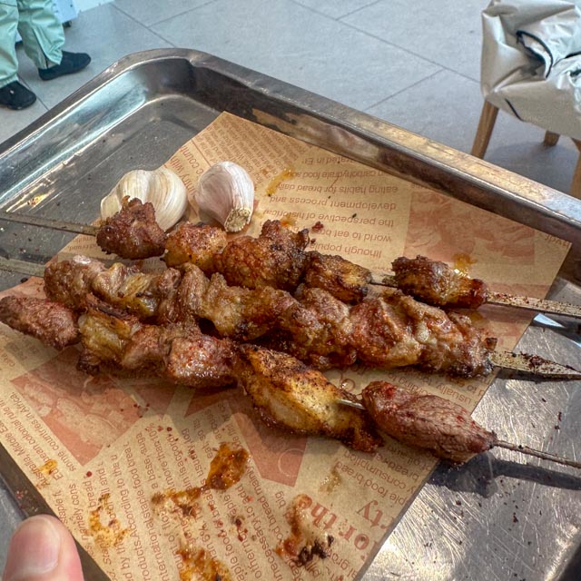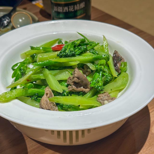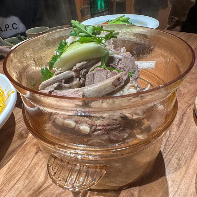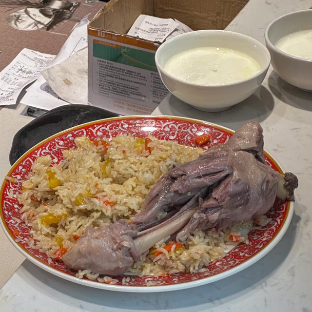 当晚入住全季,外加第二天早饭,印象颇佳。临时发现没有带上隐形眼镜,直接网上下单,一小时后送达,这样的体验也是刷新国际友人认知。虽然没有时区调整,但是时差是感受得真切。对于我们已是饭点的傍晚时分,天仍大亮,饭店空荡。我们可管不了这么多,旅店附近多的是各色美食。没多久便吃上了心心念念的正宗大盘鸡和清炖羊肉,喝上了大乌苏,棒!大盘鸡里的皮牙子和那些up主视频里的一模一样,只香不辣。饭店似乎面向游客为主,到了七八点以后,大堂还有专门的表演,不过本地人似乎也不少,口味还是有保证。