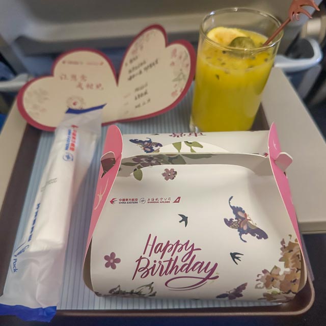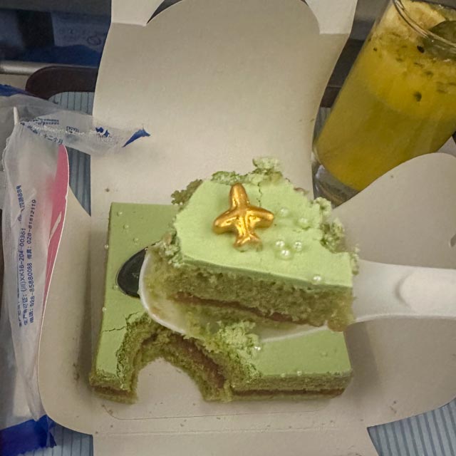 因各路好友的口口相传而种草多时的新疆滑雪之旅,在2025年末终得成行。自从北美学成单板技能多年以来,终于得以第一次回国耍帅,汇报演出,着实激动。上海飞阿勒泰的航班与西雅图飞纽约航班一样,东西跨越一整个国家,由一角直达另一隅。出发当天,未曾想还得到航司的特别关怀,获全机组祝福外加蛋糕一份,轻松收买了我的心。