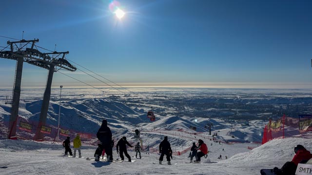 第二天一早叫了一辆车,开始了我在国内滑雪的第一站。没想到将军山滑雪场离阿勒泰市区如此近,开车没用多久便抵达雪场边,比温哥华去Cypress还要近得多,一路上两侧的房子都没有断过。拿上雪板(一块当地租的“高”仿红白KORUA Shapes),换好雪票,坐上缆车。一瞬间还真有些恍惚。雪道当天看起来,已经有几天没下过雪了,造雪机在低温中高效工作中。雪道被护栏规划的严严实实,漫山遍野几乎都是单板,颇为震撼。这里单板和双板的比例就好像去欧洲滑雪时候双板和单板的比例差不多,也从未见过这么多刻滑佬在各个道上贴地飞行。