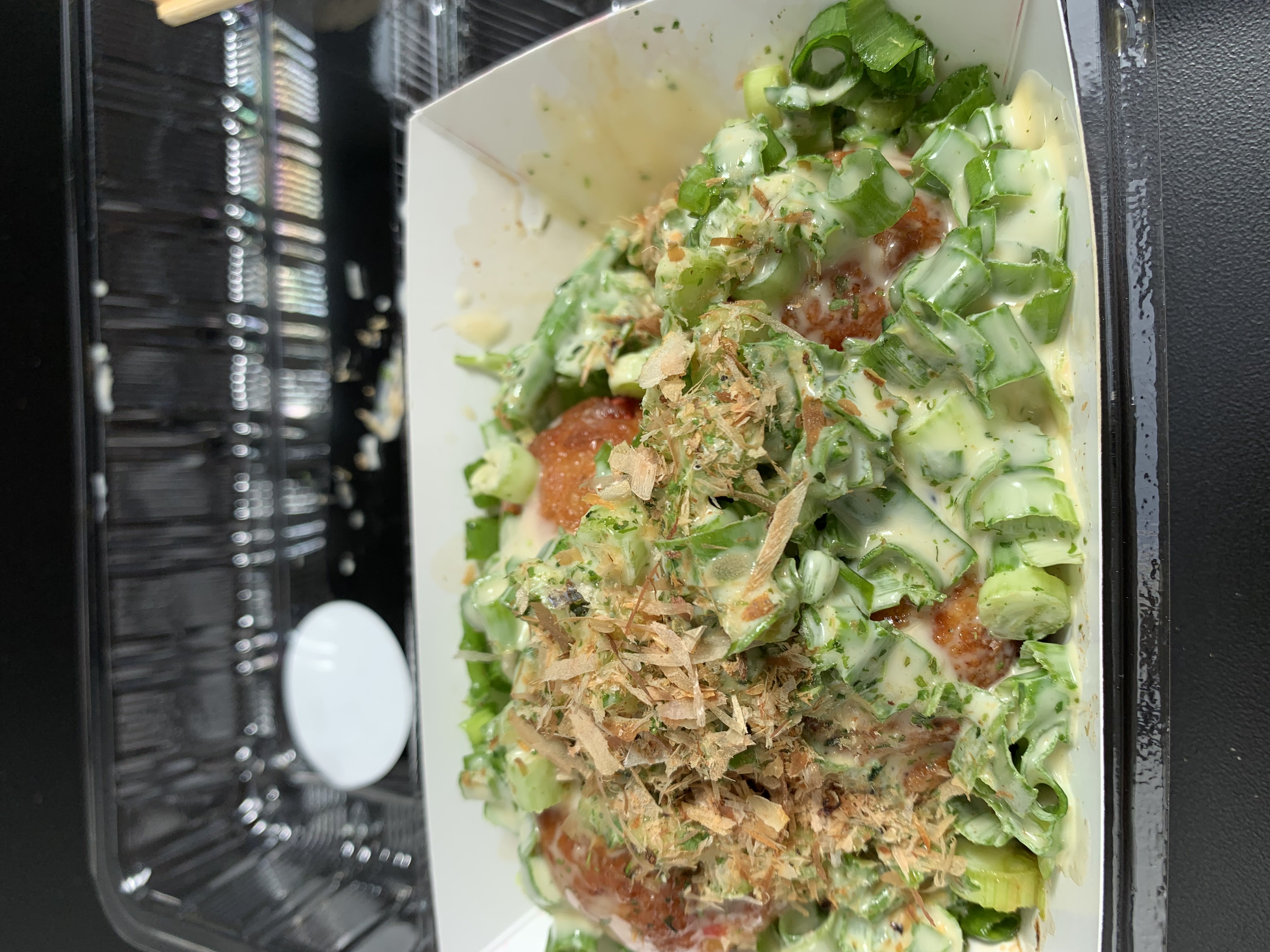 在旧金山的领事馆办理完护照后,我加急脚步去邻近的日本城果腹。先是点了一份special yuzu风味的章鱼小丸子,上来一看五个丸子被深深埋藏在葱花里面。
