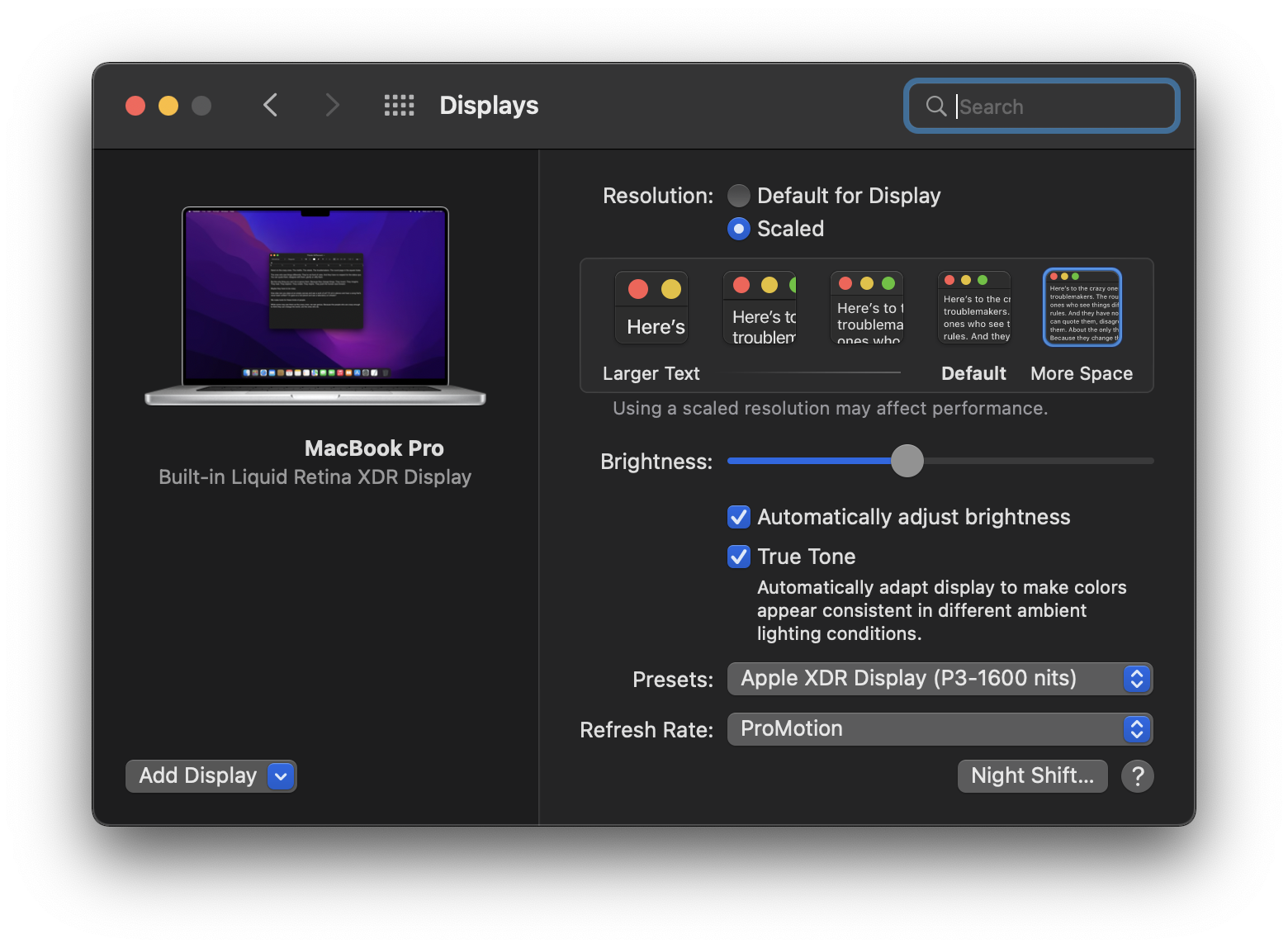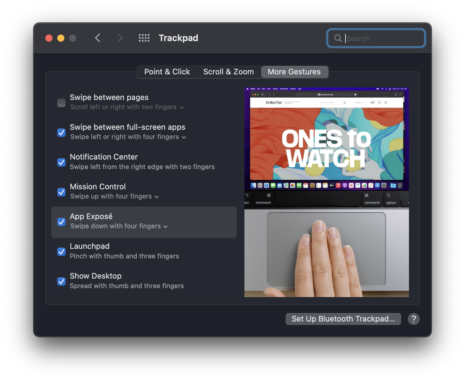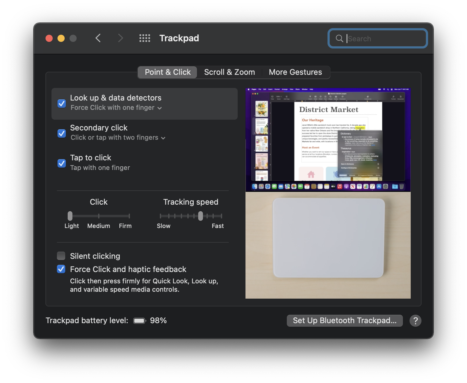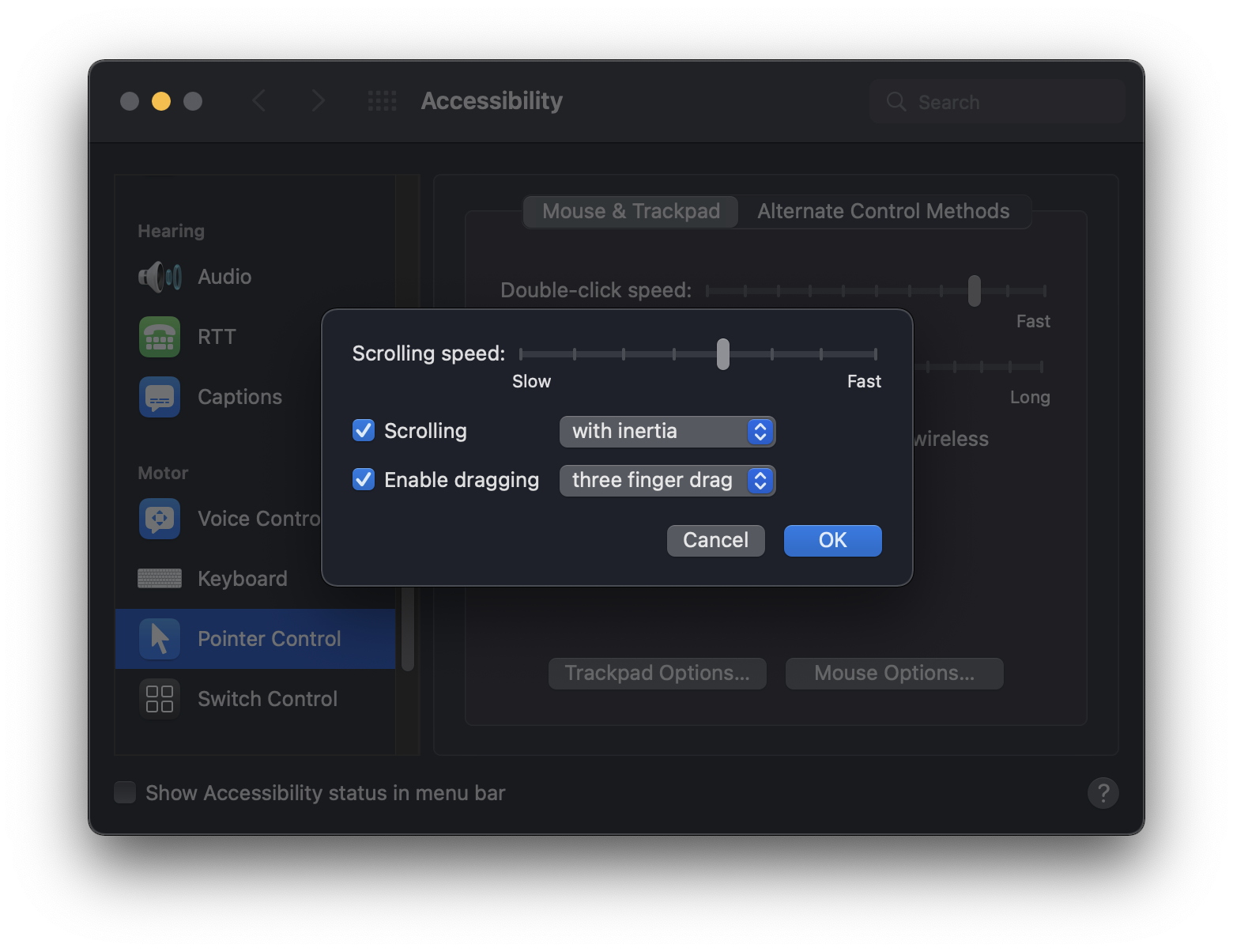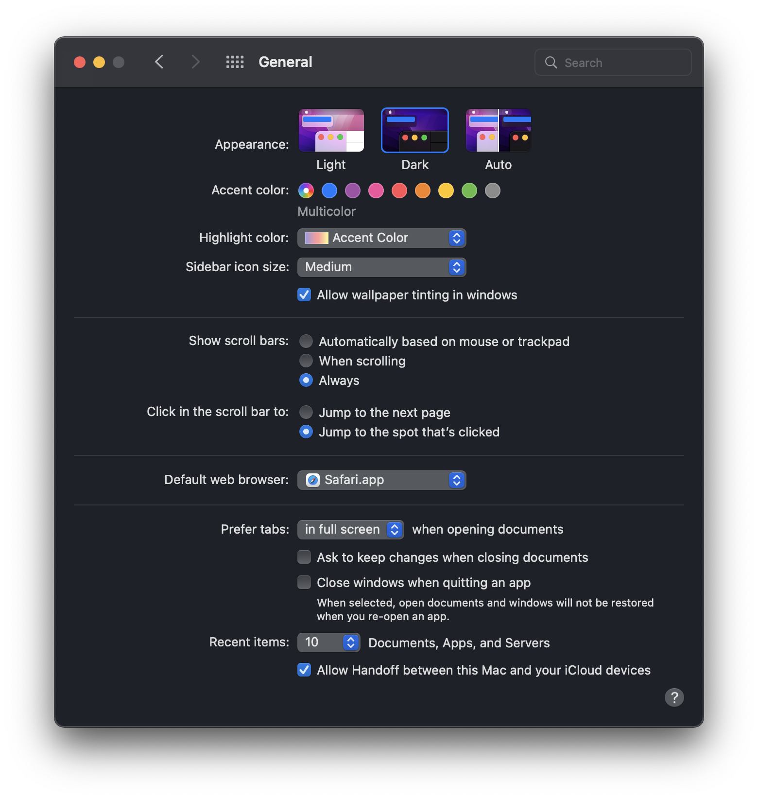 Appearance: Dark Show scroll bars: Always Click in the scroll bar to: Jump to the spot that’s clicked