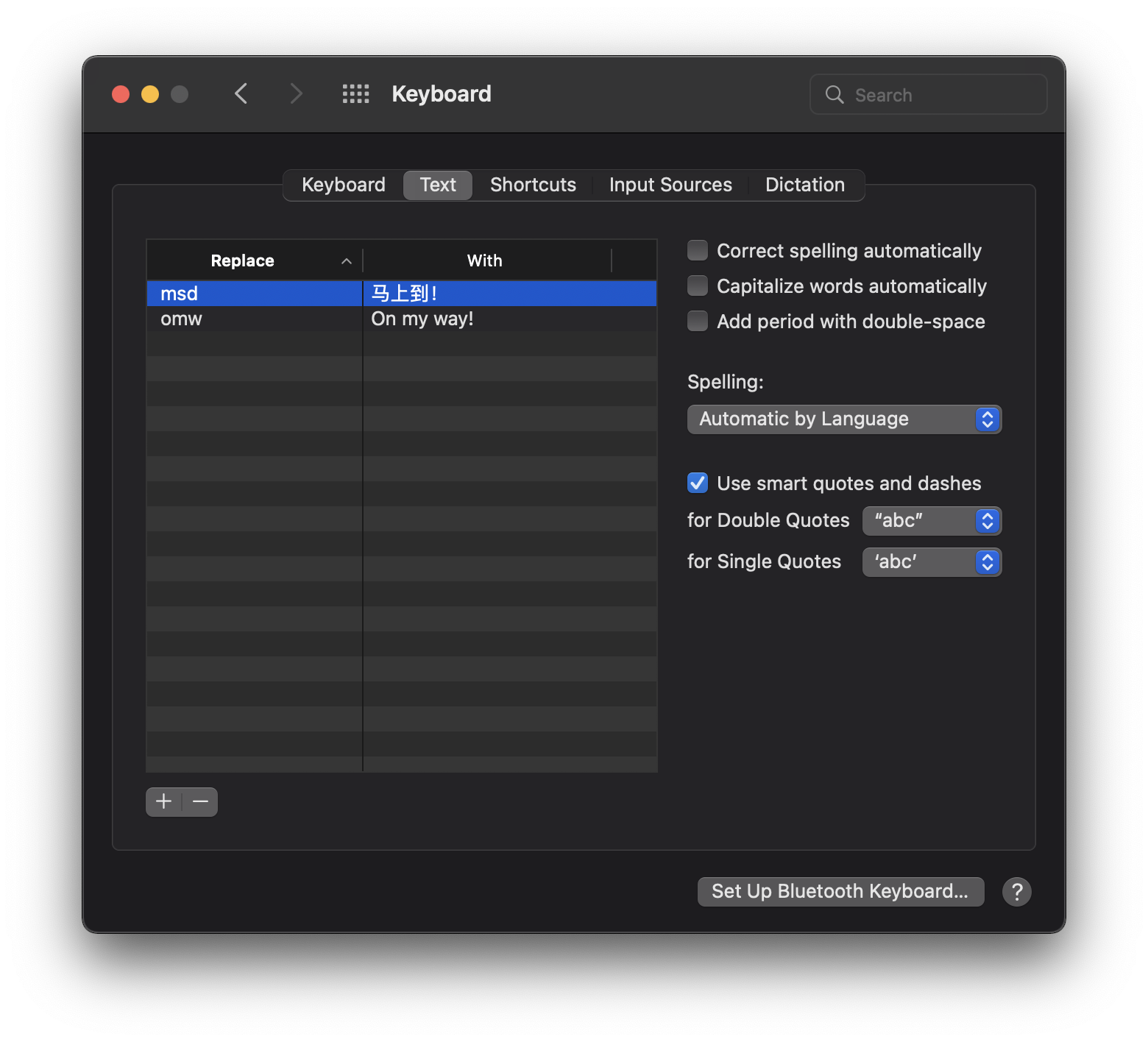 Text Correct spelling automatically: Off Capitalize words automatically: Off Add period with double-space: Off