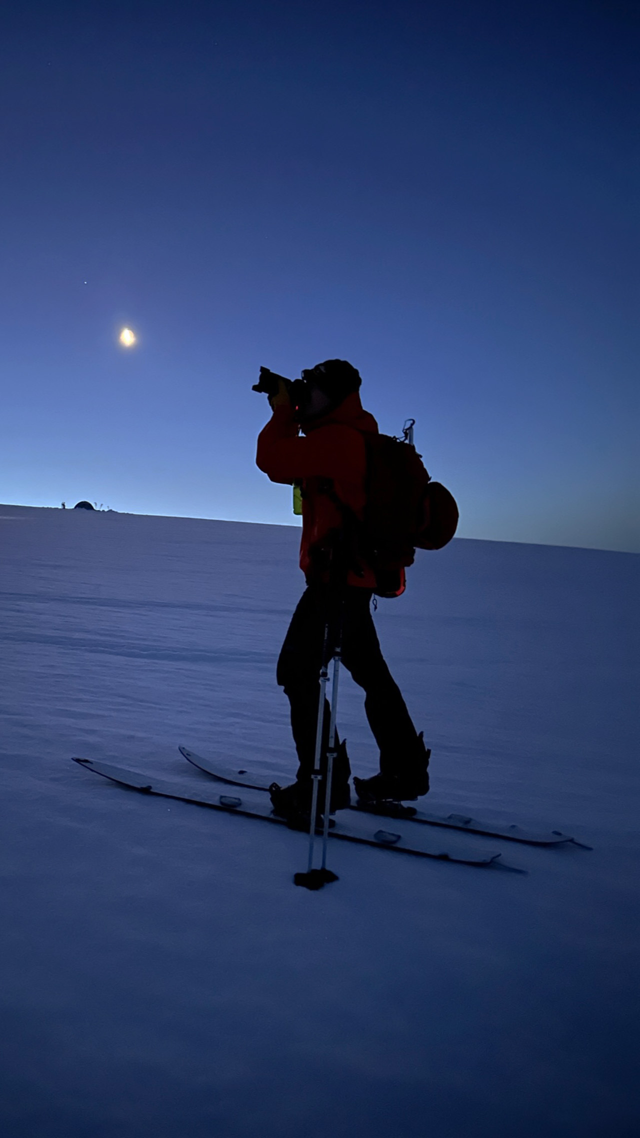 As we pressed on, we could feel the once-melted snow had refrozen beneath our feet, creating a layer of ice that made the ascent challenging without crampons. At around 4 AM, the moon finally emerged, swiftly illuminating our surroundings. With two more hours of steadfast effort, the sun eventually crept over the cliffs. The powerful solar radiation rapidly melted the frozen world around us, transforming our surroundings into a glistening wonderland.