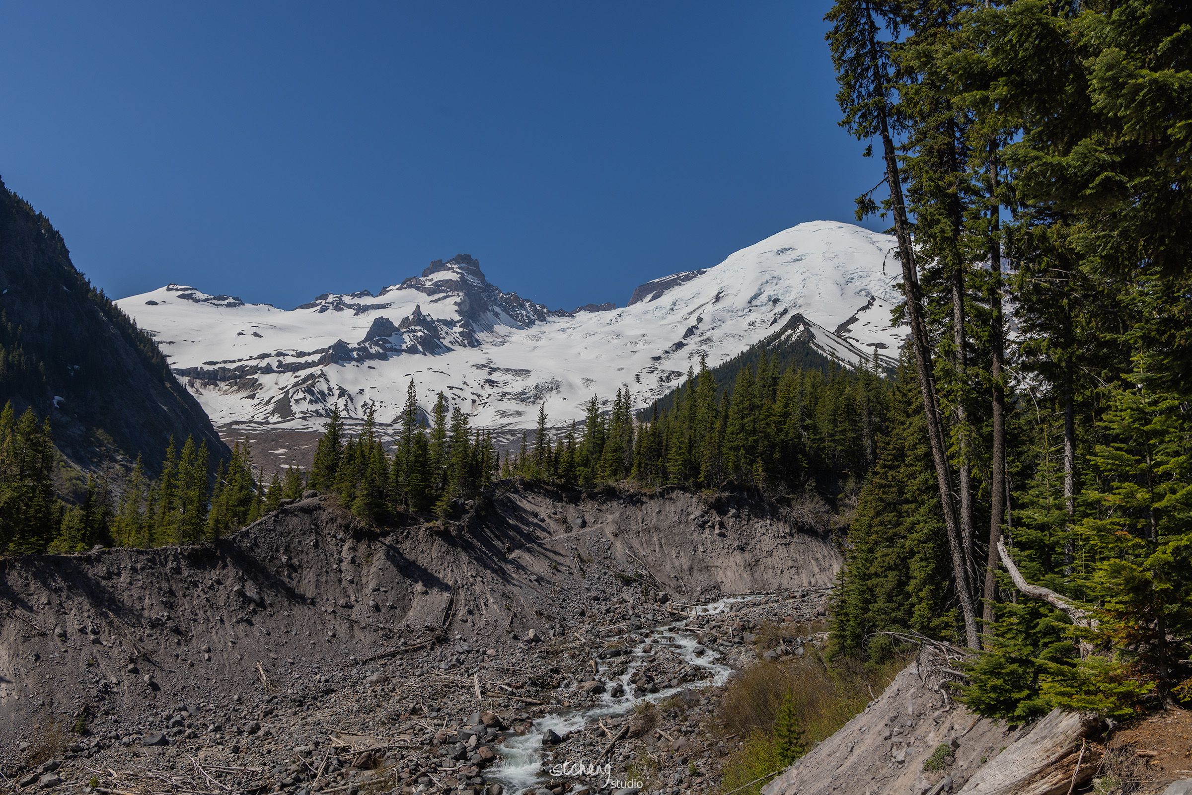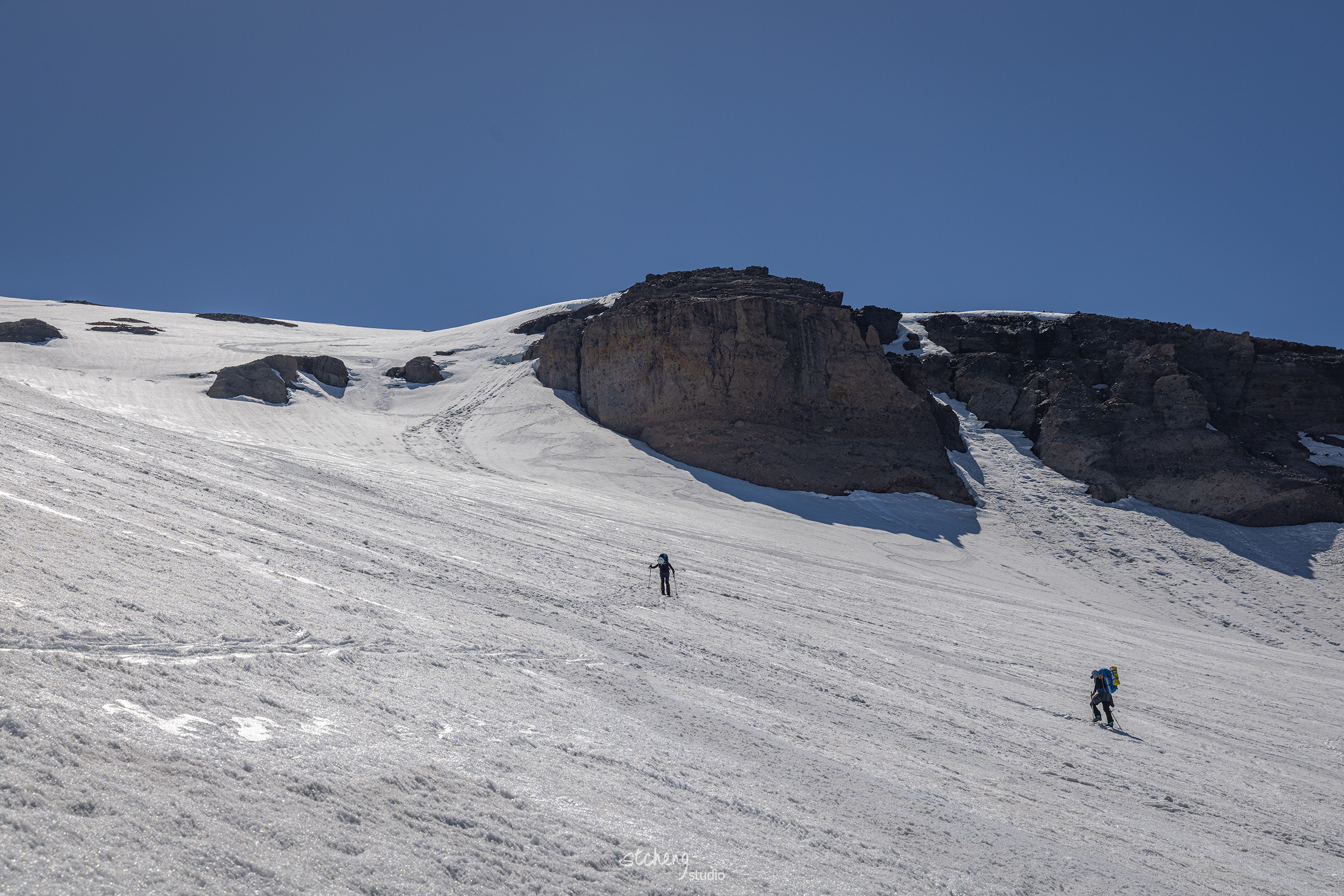 We set off at around 10AM. The trek was laborious, requiring us to bear the weight of all our equipment and camping gear on our backs until we finally reached the Glacier Basin and the adjacent river bank. Ascending under the relentless sun was no small feat; it was a taxing endeavor. Engulfed by this challenge, my friends and I kept our eyes on the trail, barely noticing the surrounding vistas, pushing ever upward. The melting snow underfoot added a slippery element to our climb, particularly challenging for us snowboarders.