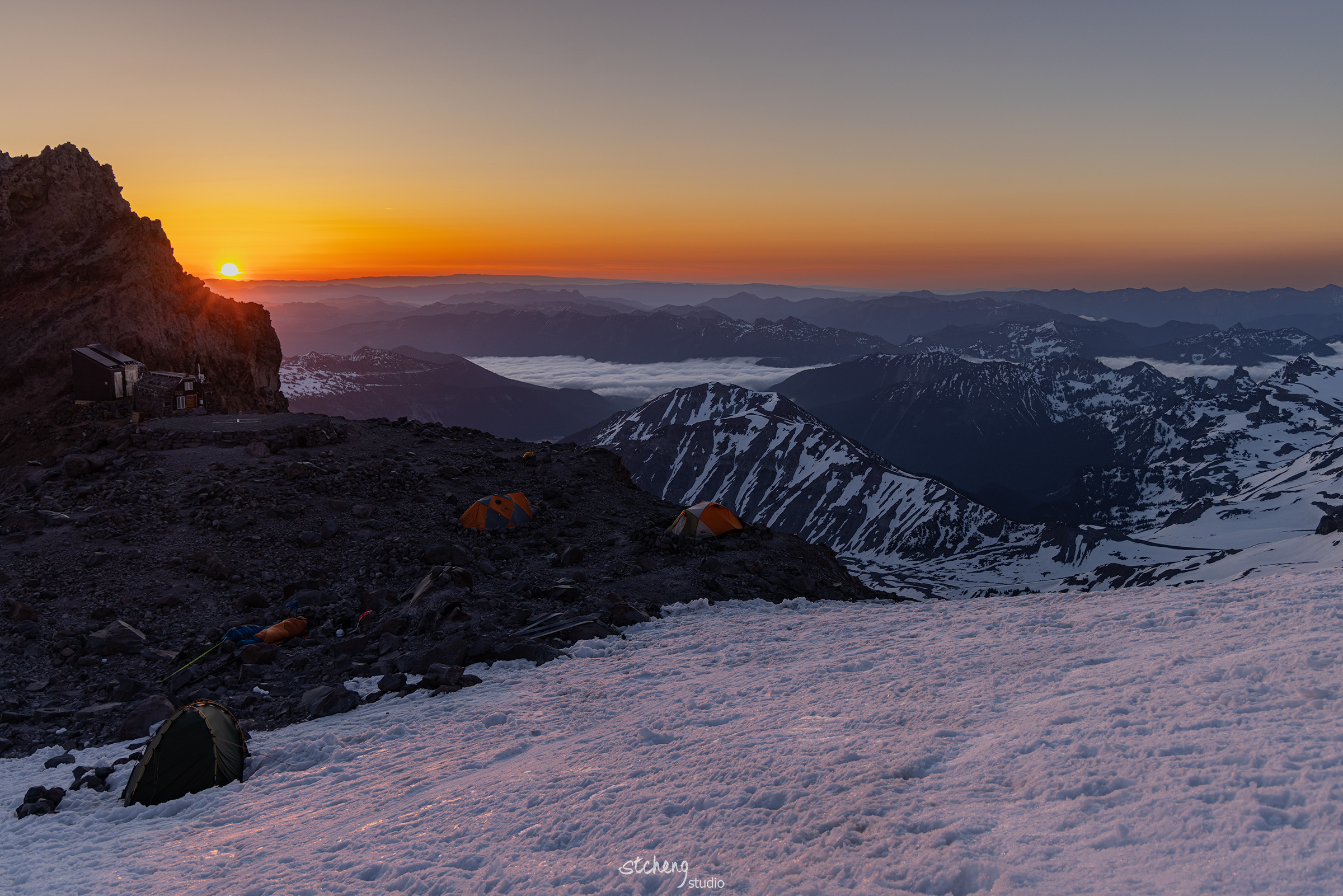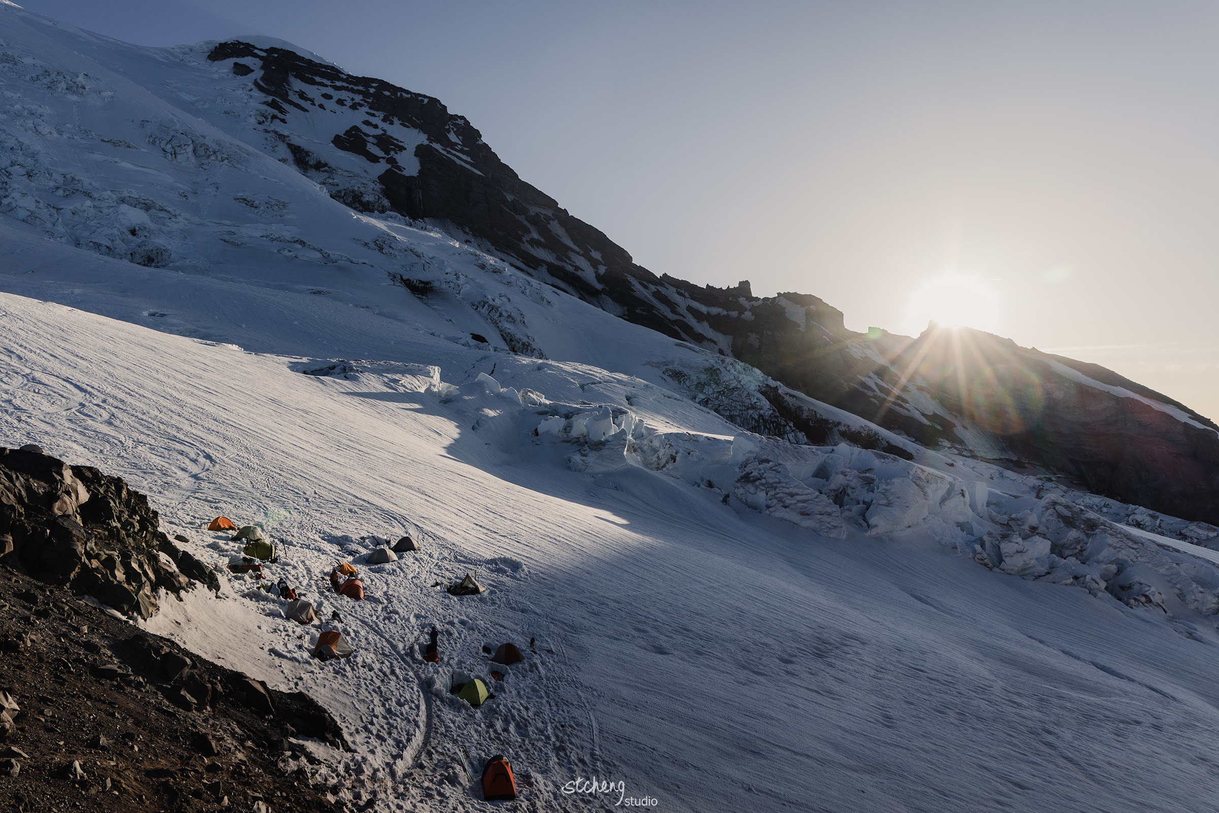 By the time we transitioned from the Inter Glacier to the Emmons Glacier, it was nearly 4PM. Upon arrival at our Camp Schurman campsite, we were relieved to find the wind mild. While the occasional gust did catch us off guard, it was, for the most part, bearable.