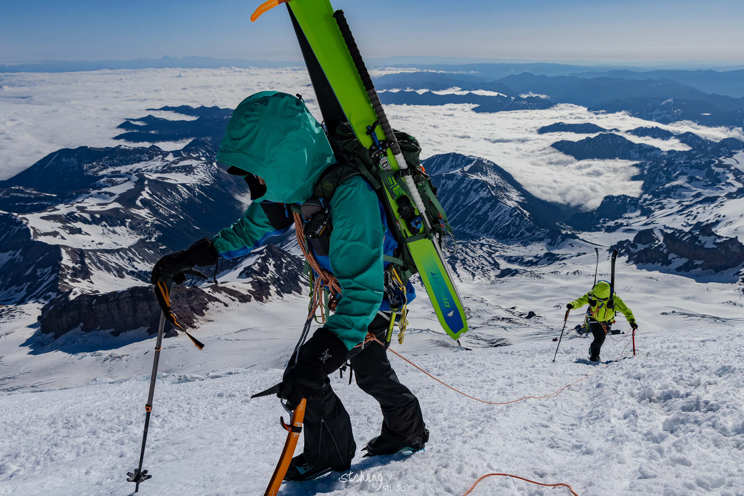 Although we set our alarms for 3AM, it wasn’t until 5AM that we were fully prepped and ready to begin our ascent. After less than thirty minutes, we found ourselves standing on the slope, basking in the dawn sunlight filtering in from the distant Cascade Range. A sea of clouds gradually gathered, swallowing the lower forests and leaving only the peaks of the Cascade Range visible, akin to islands emerging from an ethereal ocean. The sky transitioned from a dark blue to a brilliant orange before settling into a clear azure. We divided ourselves into two teams, tethering each member with ropes, and steadily continued our upward journey.