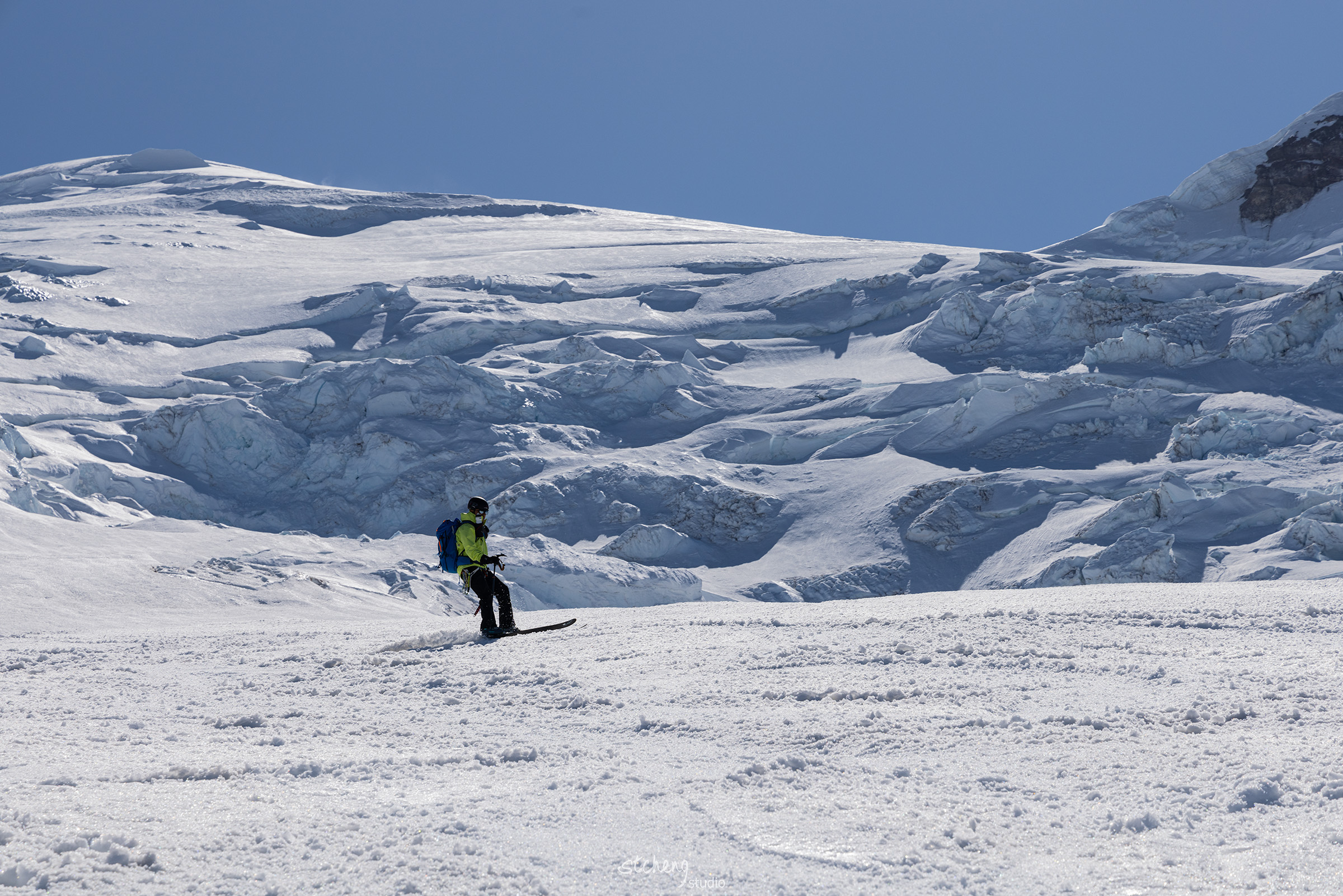 The descent, I would say, was quite an ordeal; one where we found ourselves sliding on the surface of a freezing glacier littered with irregularly shaped ice chunks. For the sake of safety, we had to dismount our snowboards and navigate on foot across the traverse route, keenly aware of the crevasse lurking beneath. Upon returning to the Emmons Glacier, we retraced our morning tracks to ride downhill. Despite basking under the sun for almost an entire day, the glacier remained as icy as stone. A fragile layer of ice crystals lightly coated the surface, undulating like sand waves when wind stirred them. Alarmingly, the crevasses we had crossed earlier in the morning were noticeably widening.
