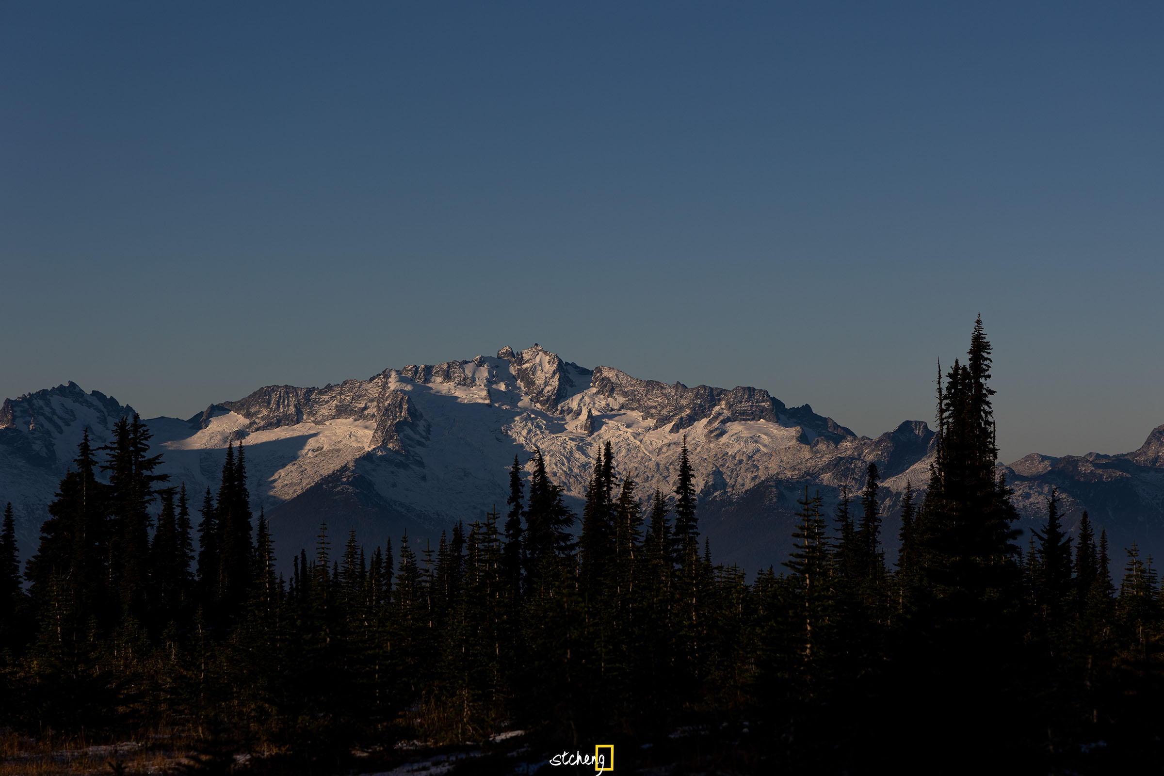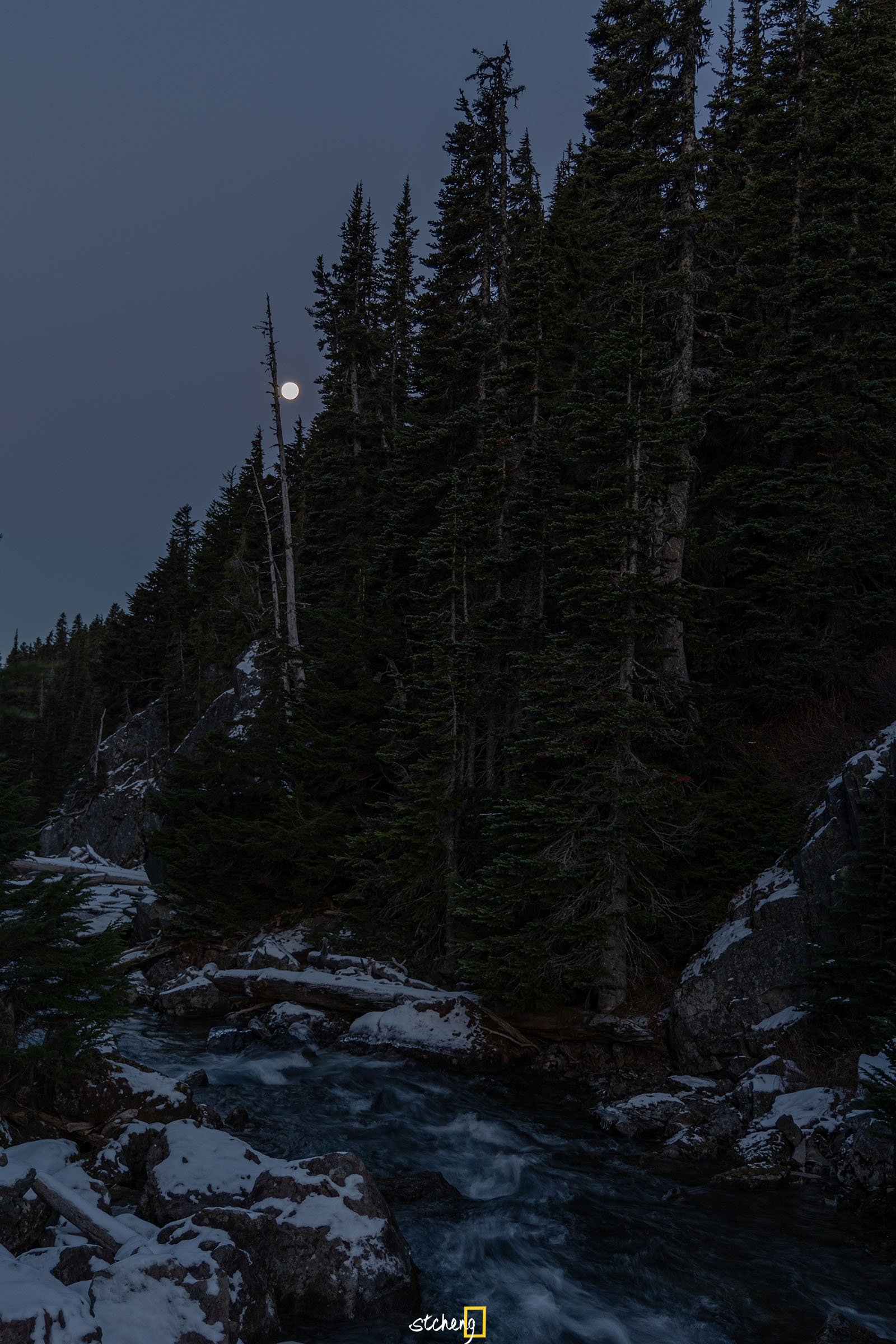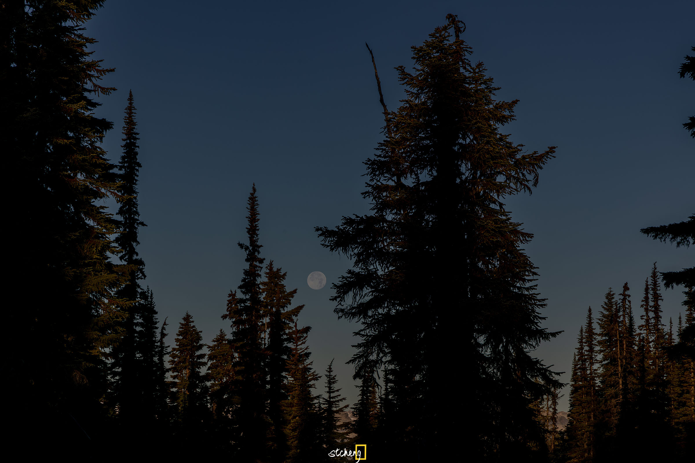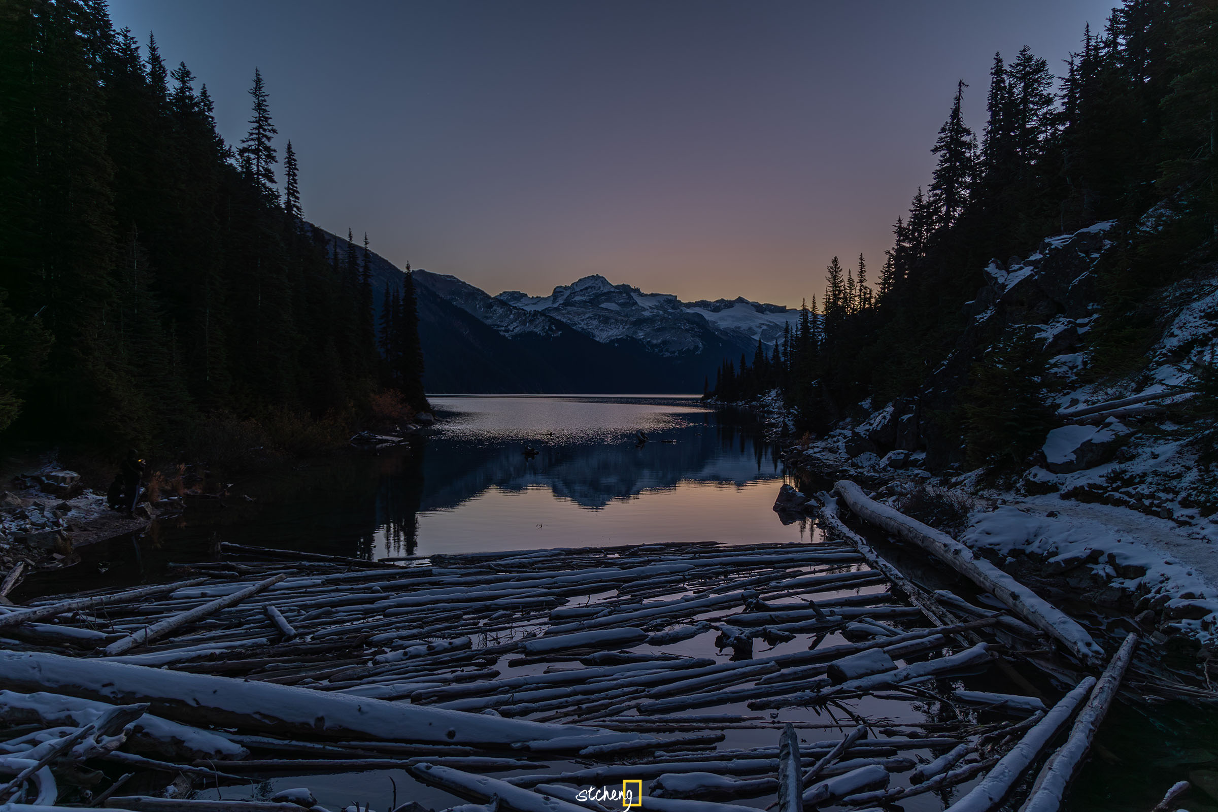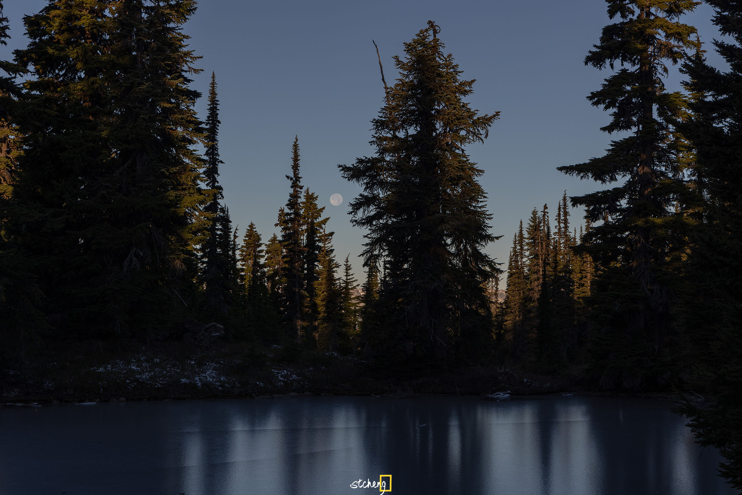We set out at around 5 AM, but the sun didn’t rise until after 7 AM, when we had already passed the Garibaldi Lake Campground. The moon was still high in the sky, and the lake water was tranquil.