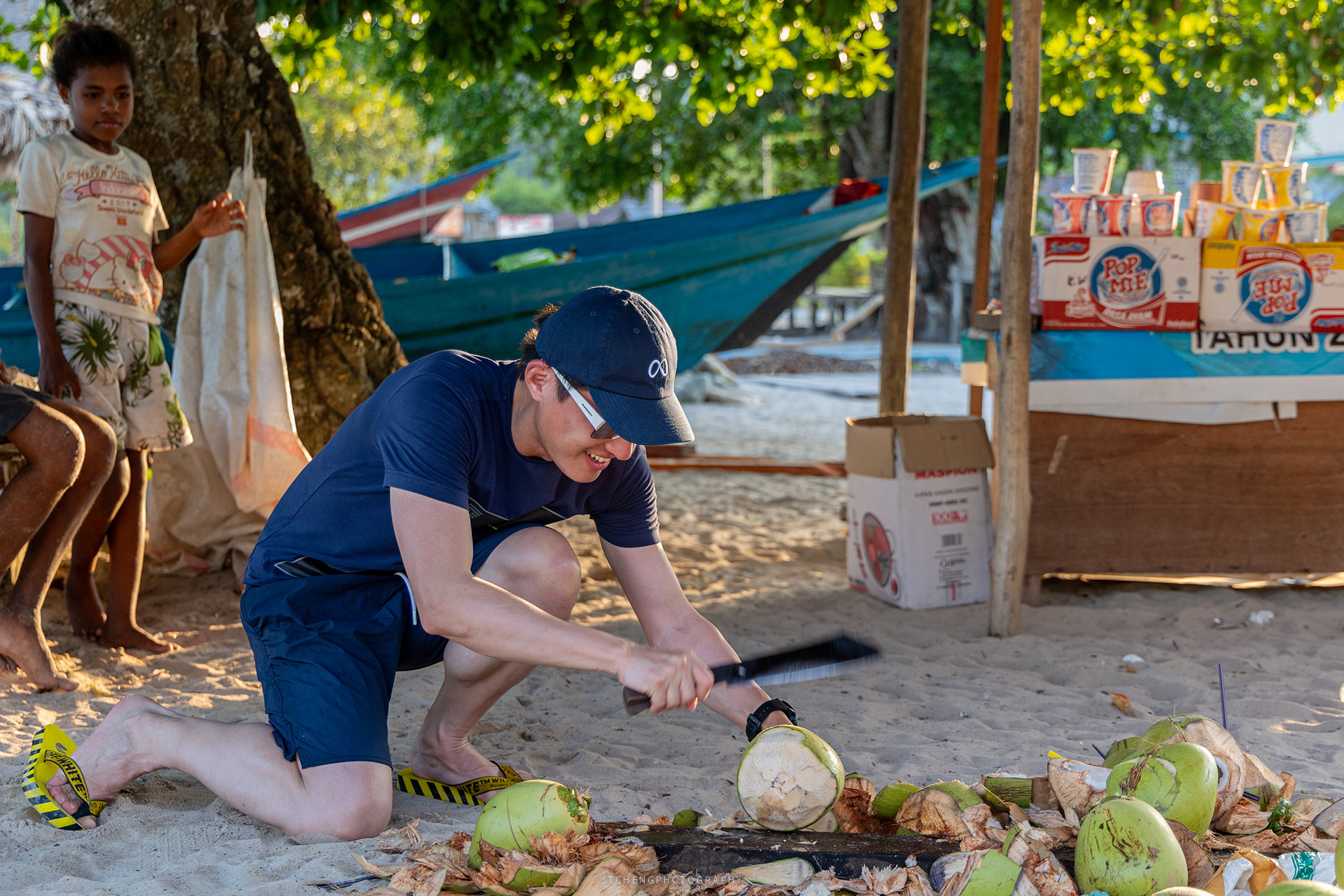 Though not entirely fresh, it was my first time cutting open coconuts, and it was quite fun! The knife was not as sharp as I had expected, but the girl managed it very well.