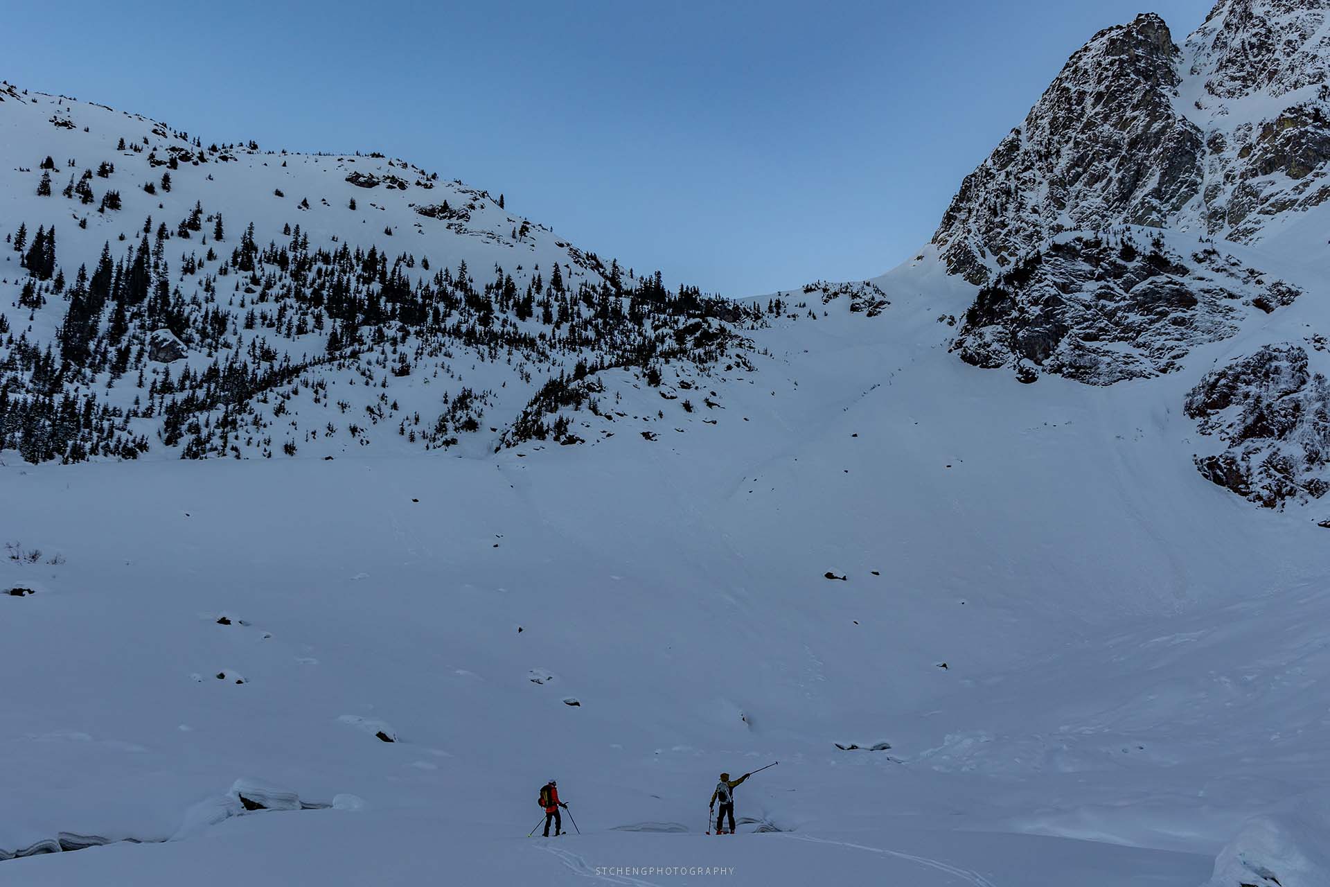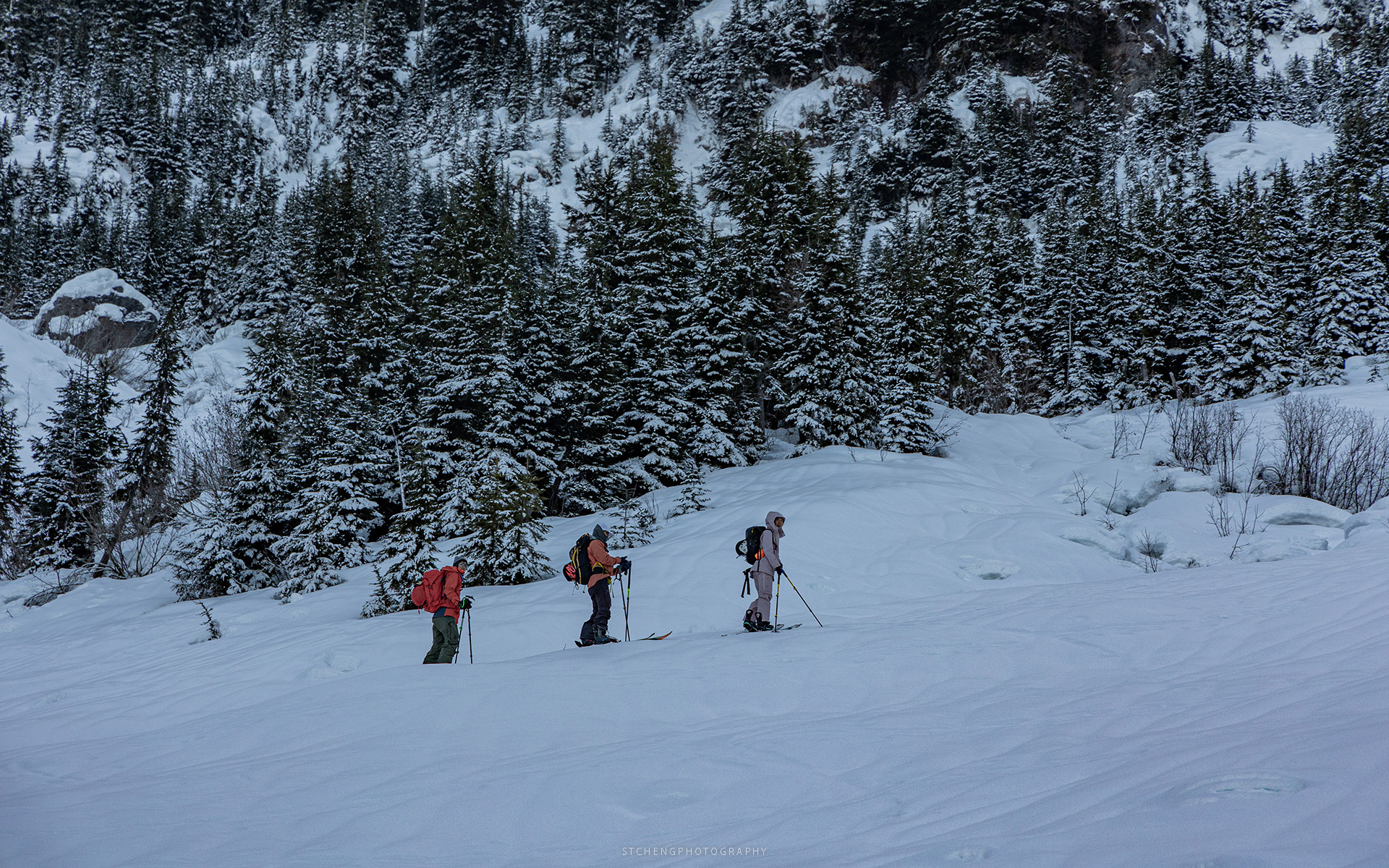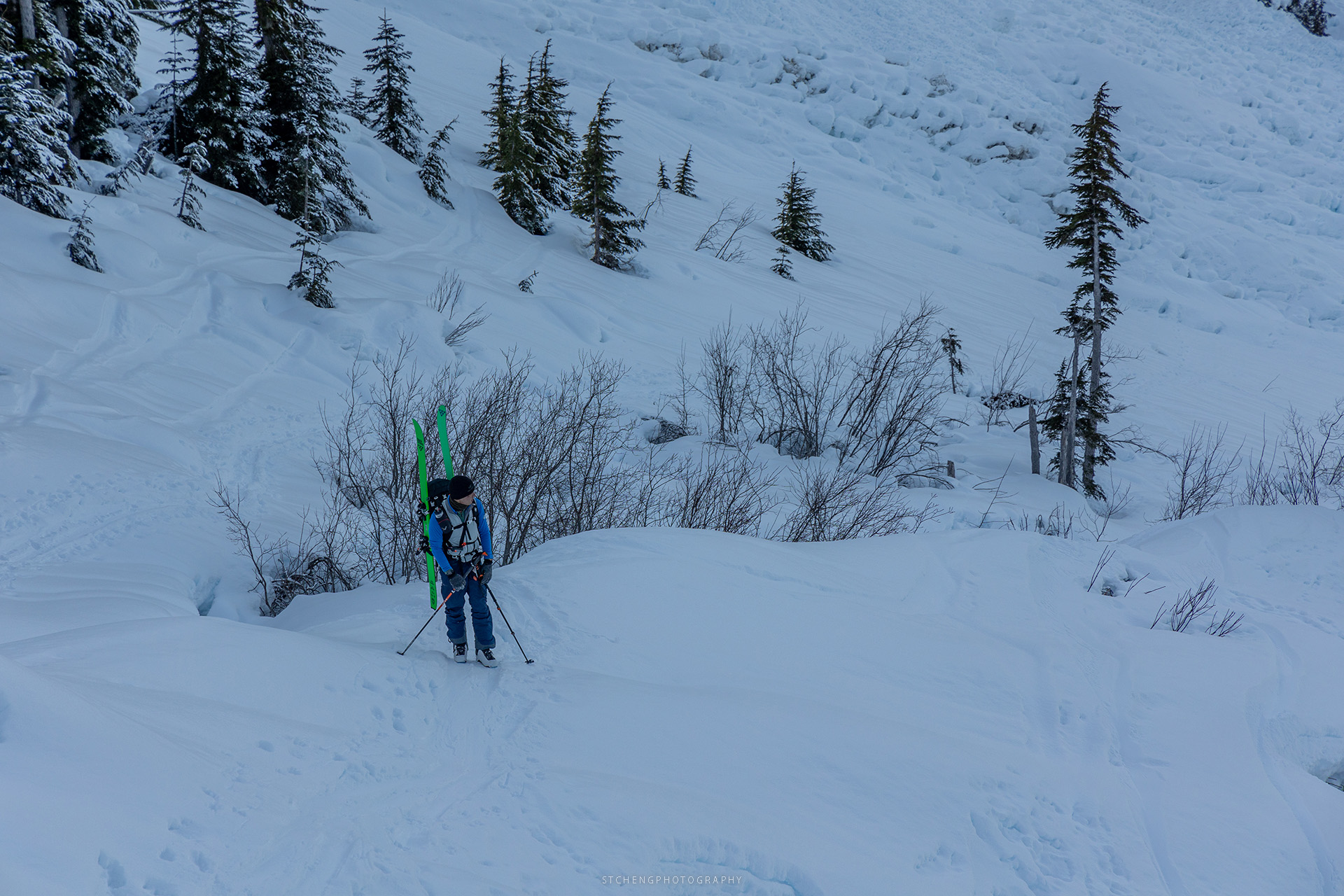 When we arrived at the parking lot, the local staff of Mt. Baker Ski Area had just started to arrive. Then the morning golden hour began. It was the alpineglow. It was probably one of the most pinkish and orange skies I had ever seen. Sadly, at that time, we were touring on routes surrounded by trees. By the time we entered an open area, the sky was already too bright.