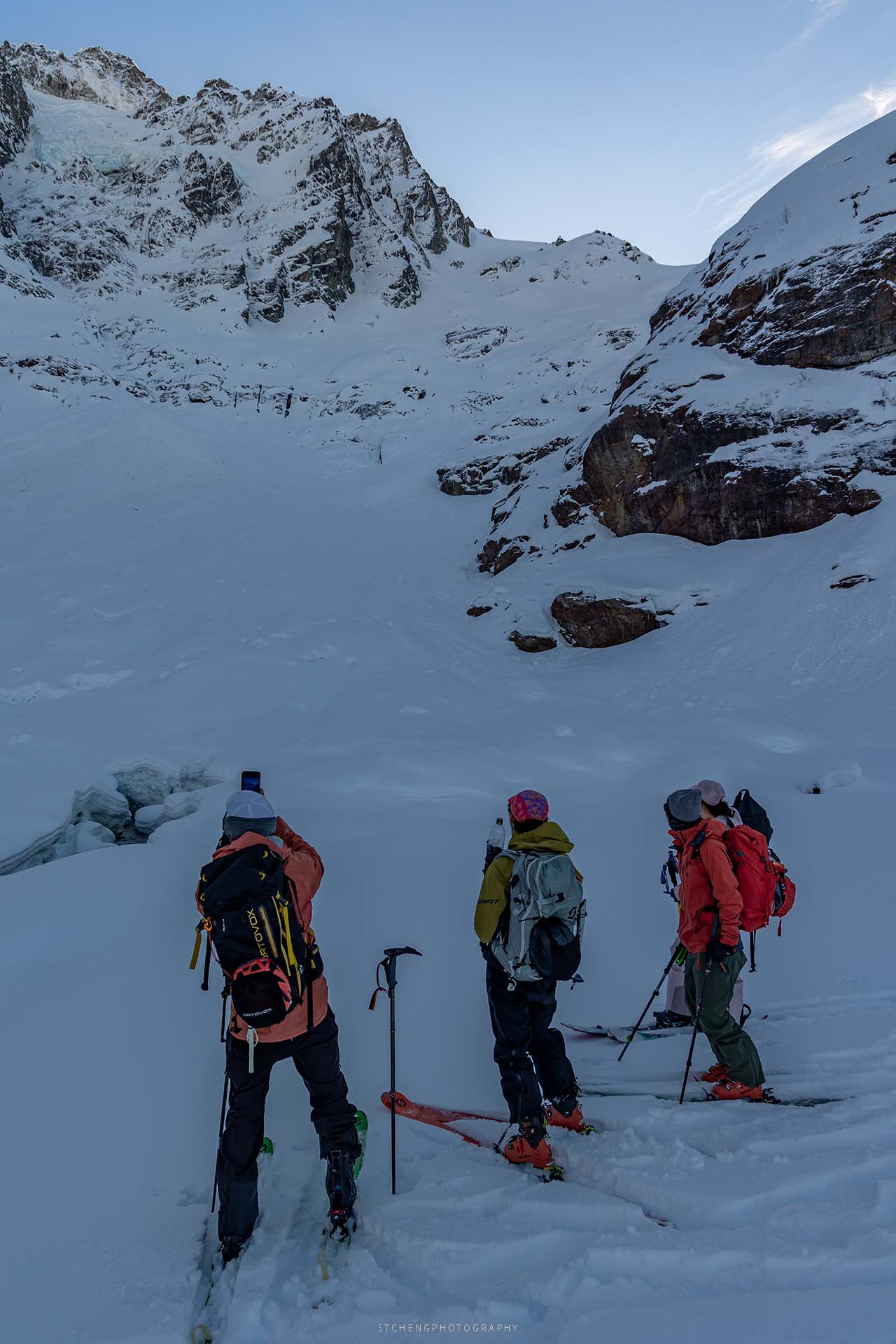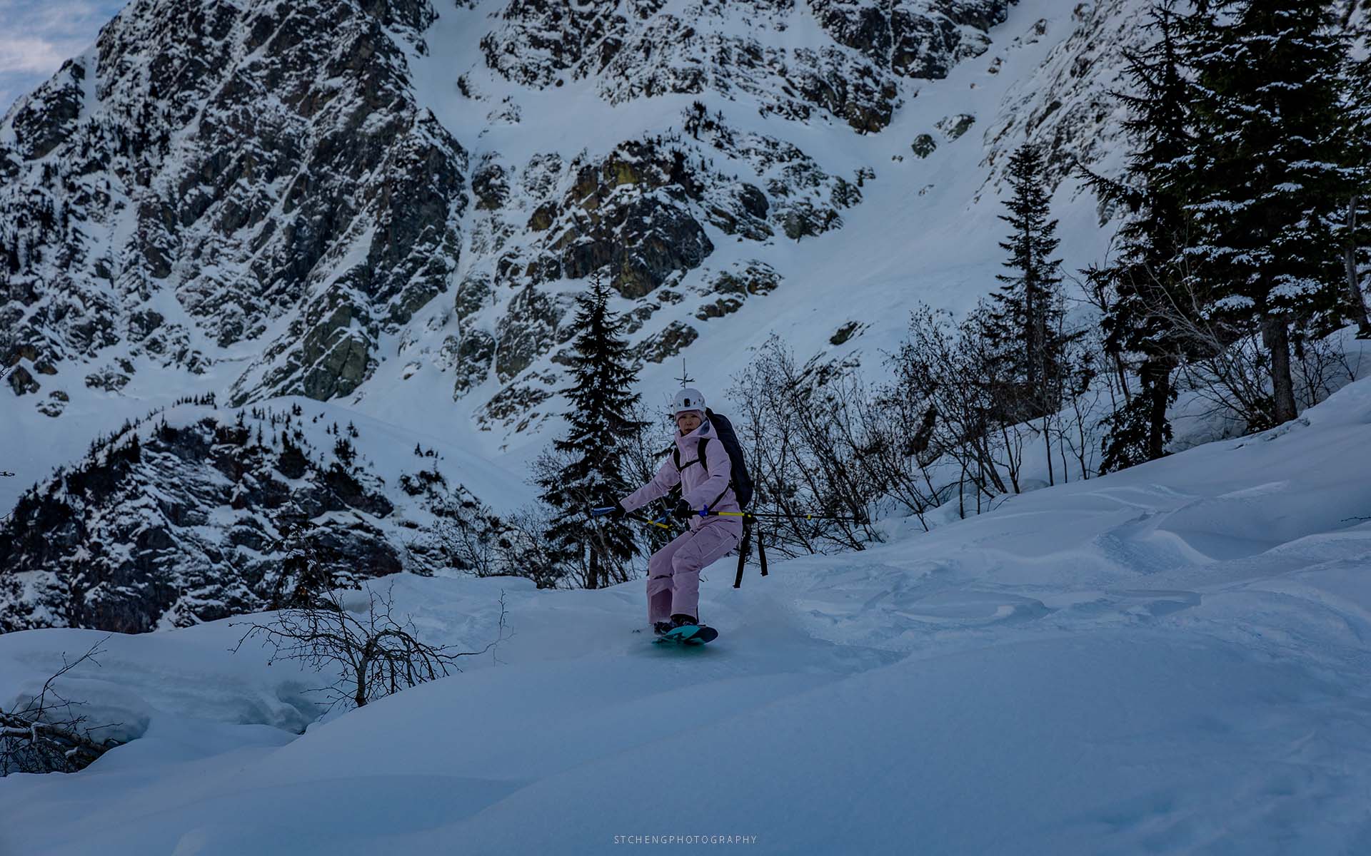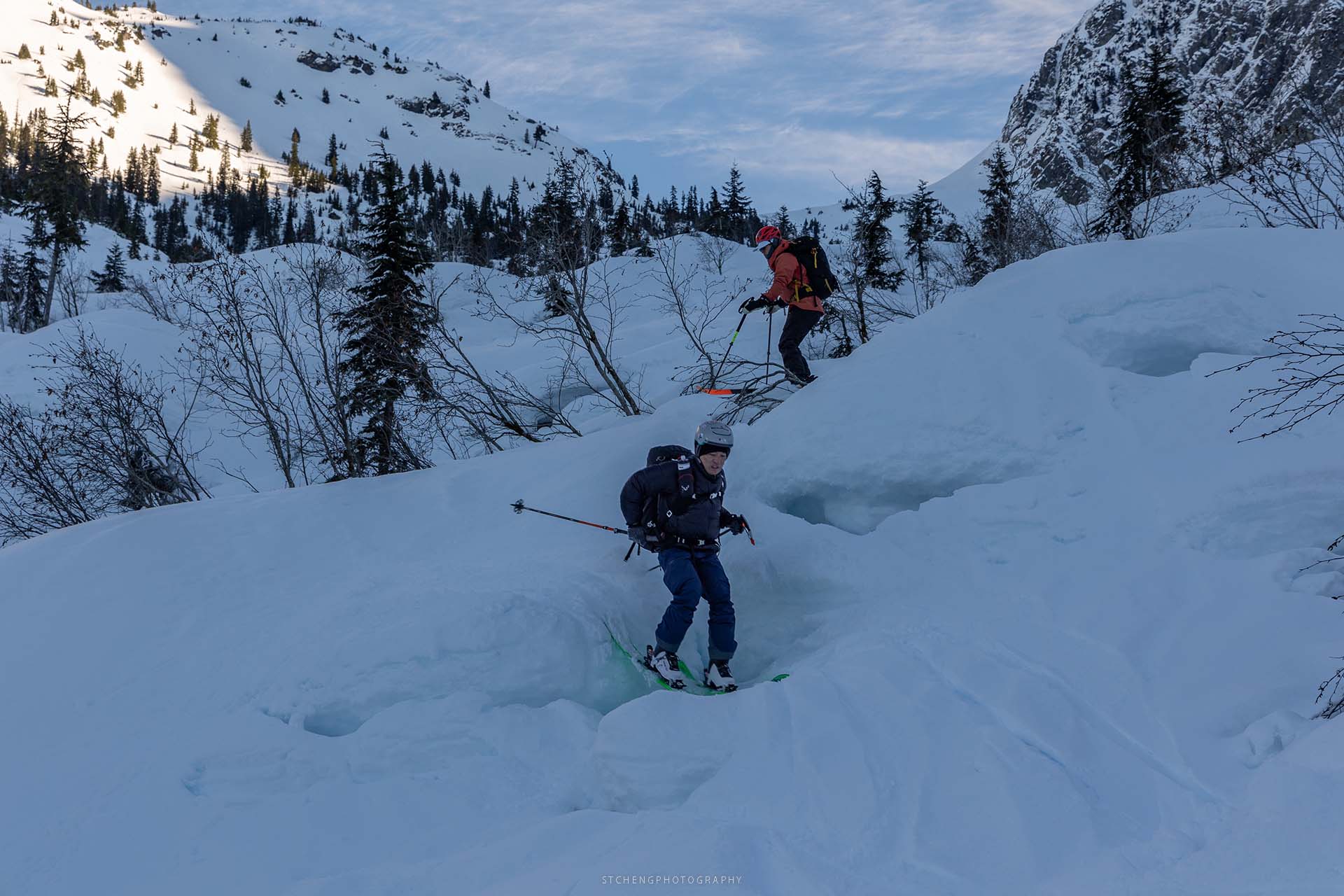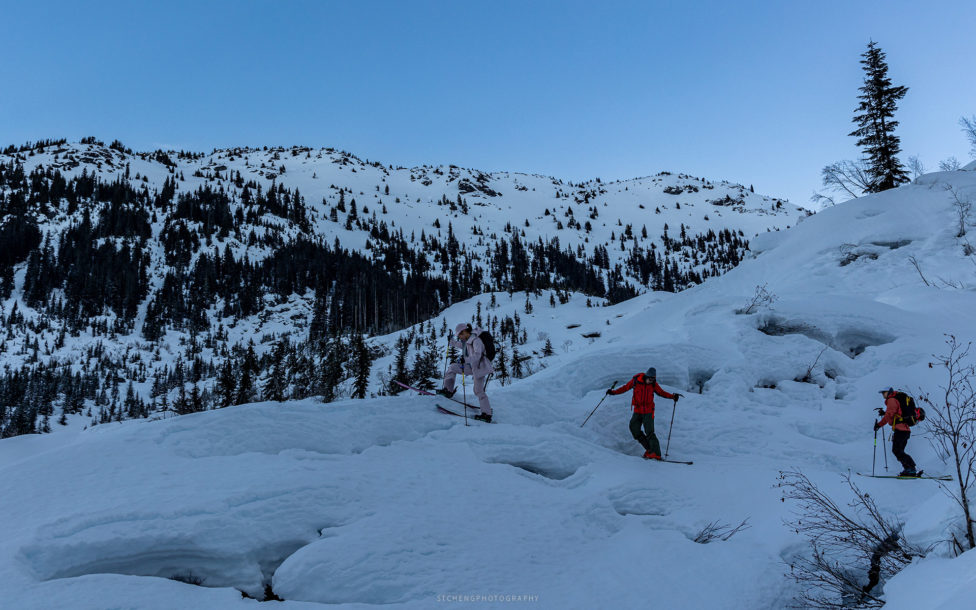 When we arrived at the parking lot, the local staff of Mt. Baker Ski Area had just started to arrive. Then the morning golden hour began. It was the alpineglow. It was probably one of the most pinkish and orange skies I had ever seen. Sadly, at that time, we were touring on routes surrounded by trees. By the time we entered an open area, the sky was already too bright.