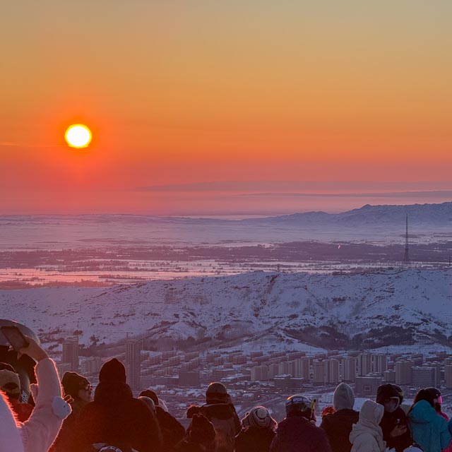 第二天一早叫了一辆车,开始了我在国内滑雪的第一站。没想到将军山滑雪场离阿勒泰市区如此近,开车没用多久便抵达雪场边,比温哥华去Cypress还要近得多,一路上两侧的房子都没有断过。拿上雪板(一块当地租的“高”仿红白KORUA Shapes),换好雪票,坐上缆车。一瞬间还真有些恍惚。雪道当天看起来,已经有几天没下过雪了,造雪机在低温中高效工作中。雪道被护栏规划的严严实实,漫山遍野几乎都是单板,颇为震撼。这里单板和双板的比例就好像去欧洲滑雪时候双板和单板的比例差不多,也从未见过这么多刻滑佬在各个道上贴地飞行。